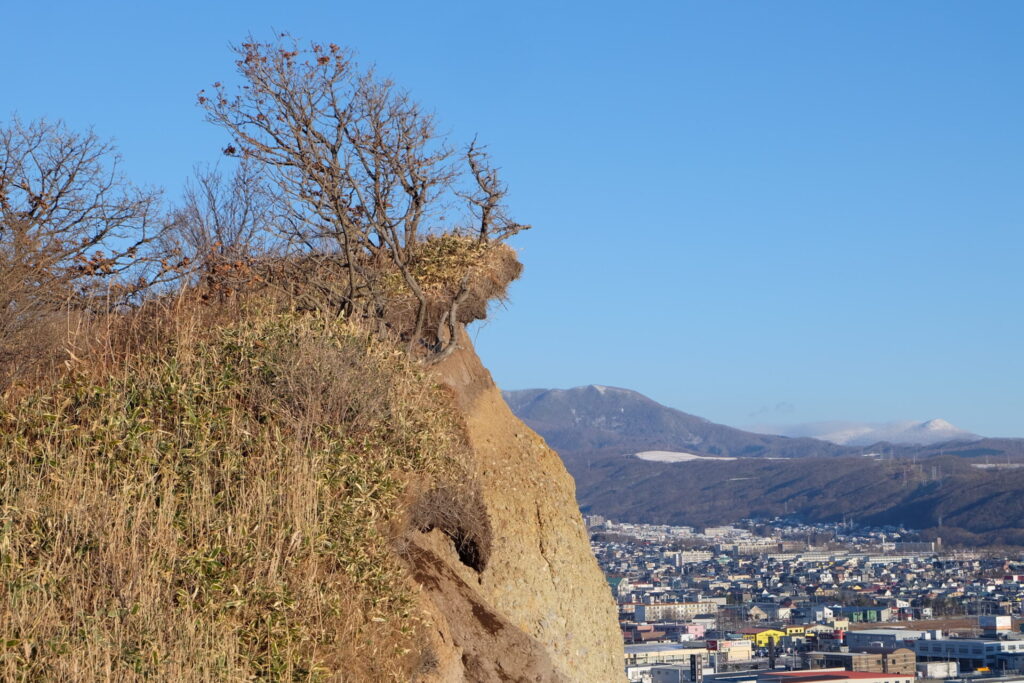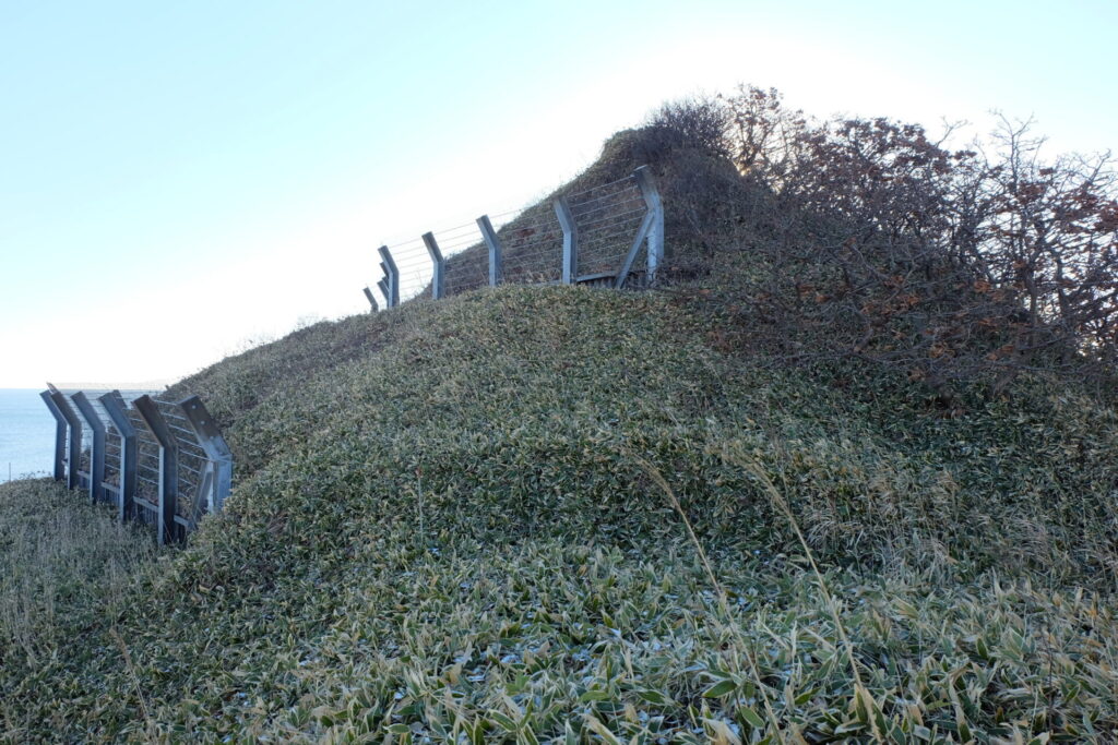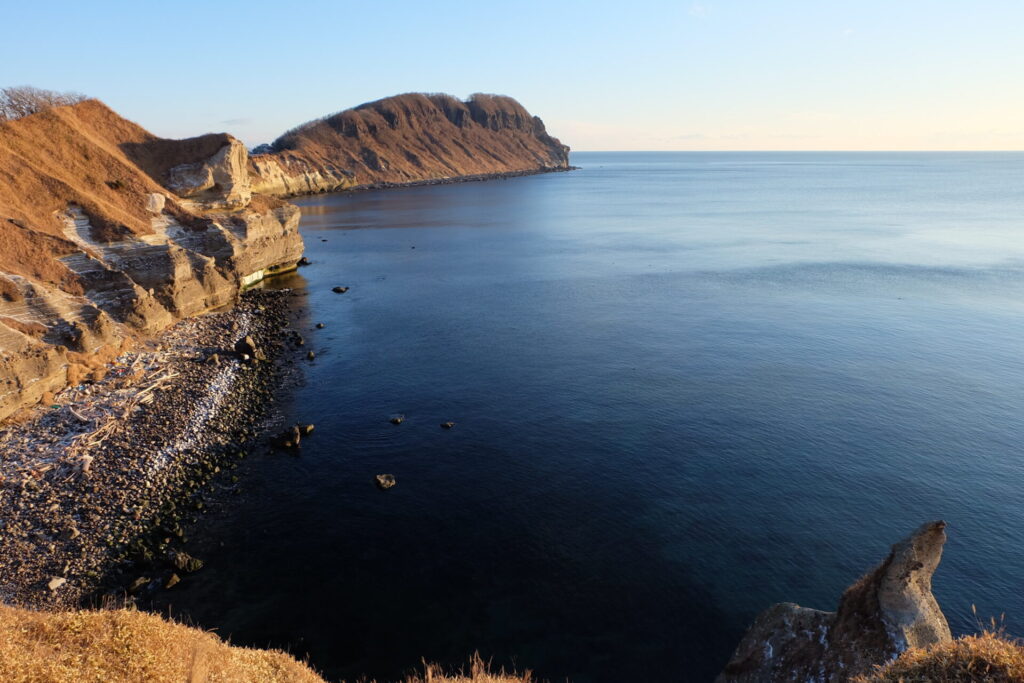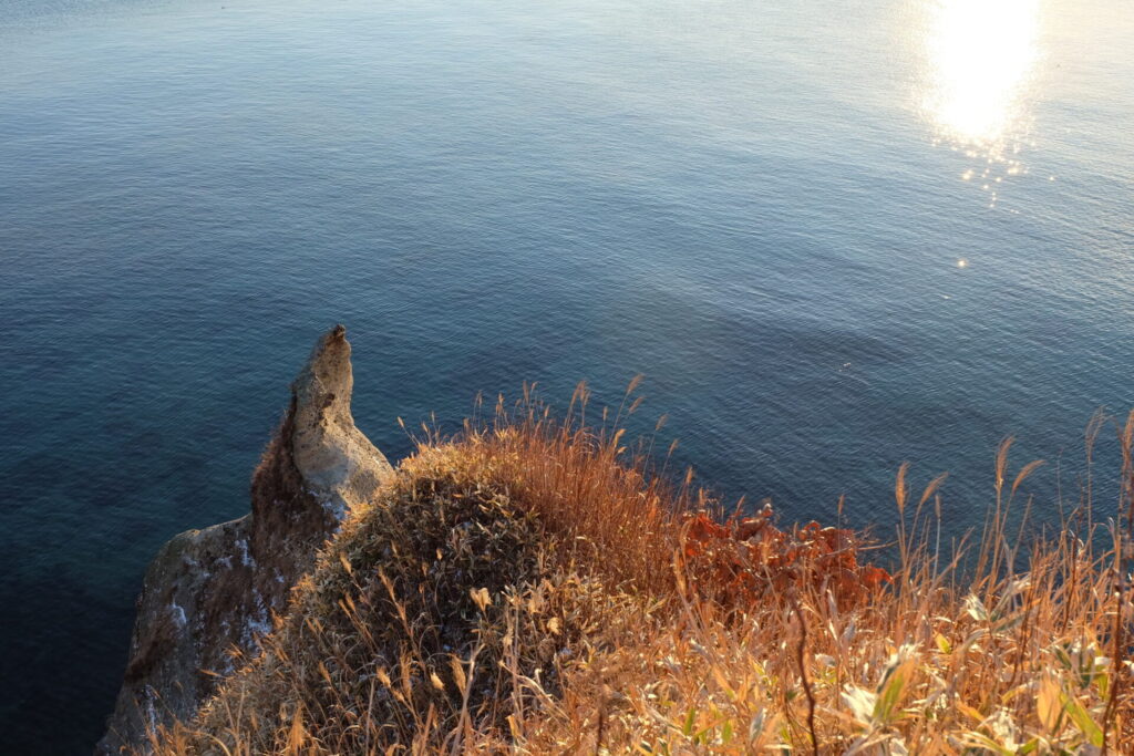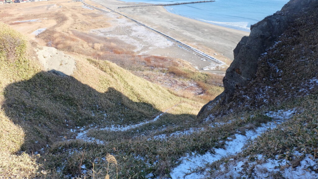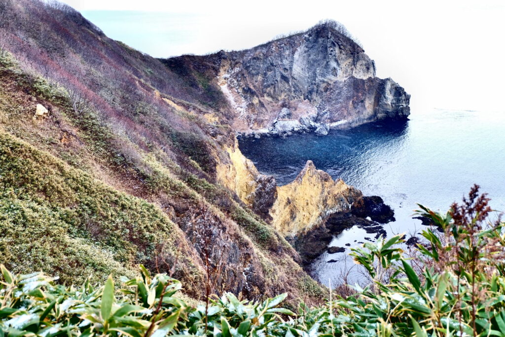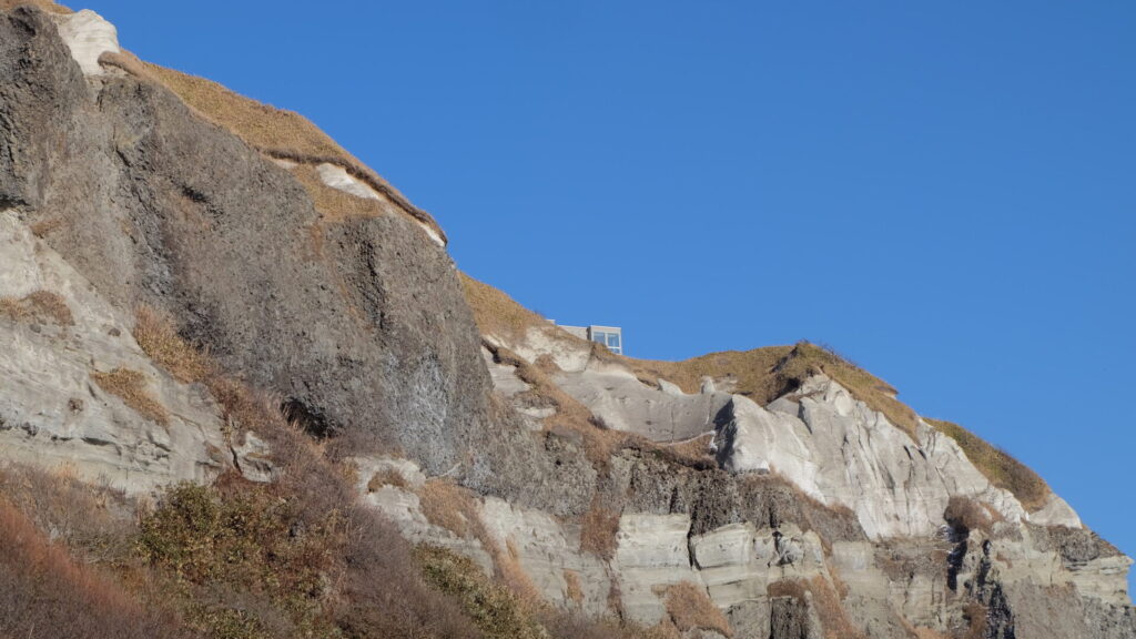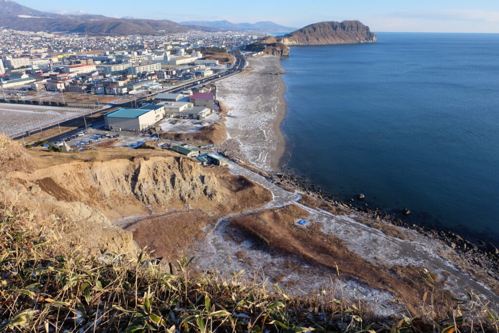 ▼イタンキ岬の断崖は北海道から「急傾斜地」に指定されている。