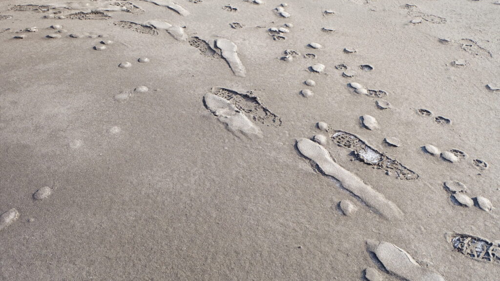 ▼人と動物の足跡が浮き上がる現象。天気は良いが、相当寒い!