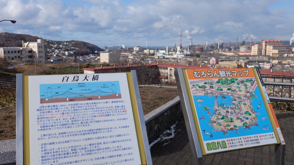 ▼白鳥大橋と新日鐵住金(株) 室蘭製鉄所が収まる。室蘭八景となるのも頷ける。