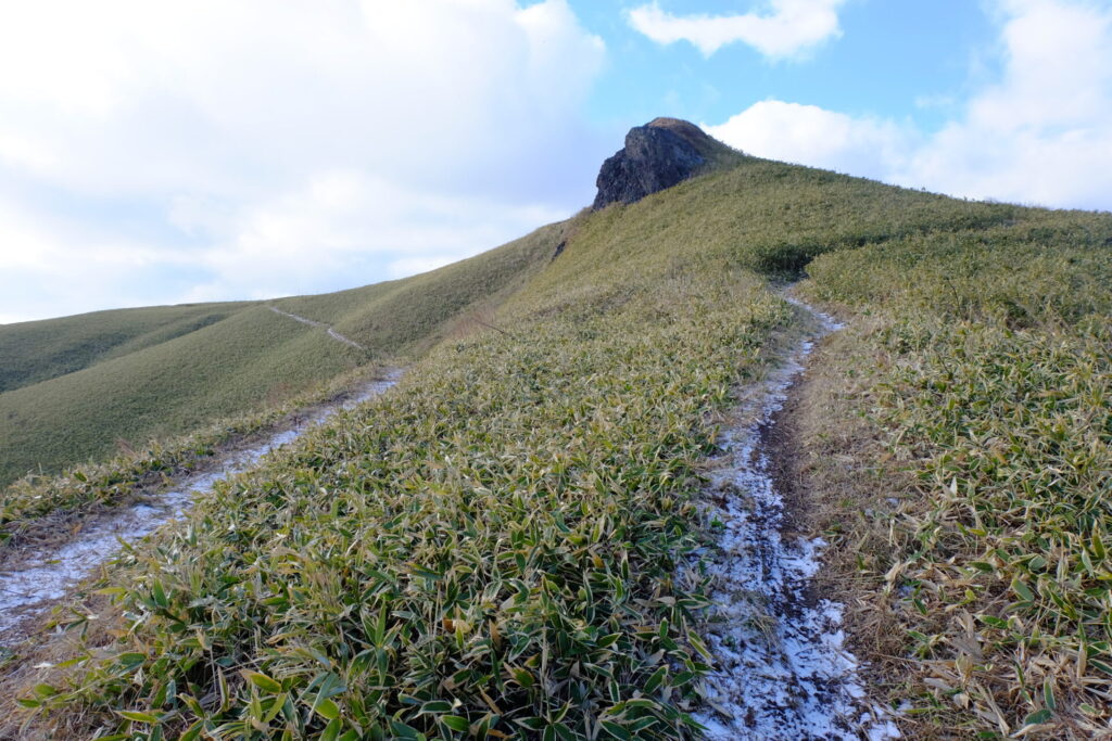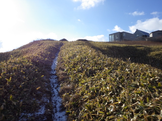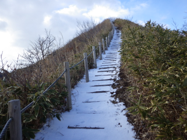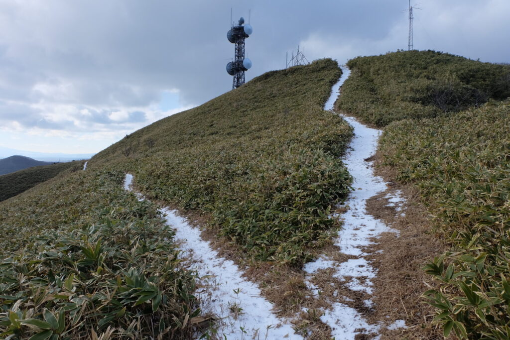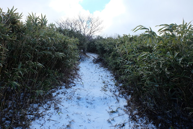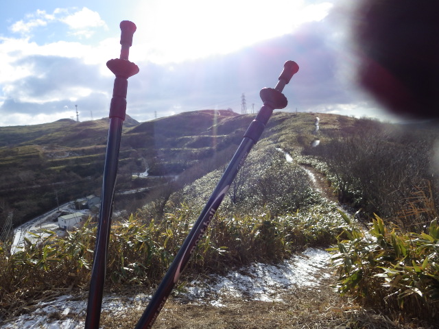 ▼大分来た。エニ山まで戻る! 雪で滑るのでポールを出す。
