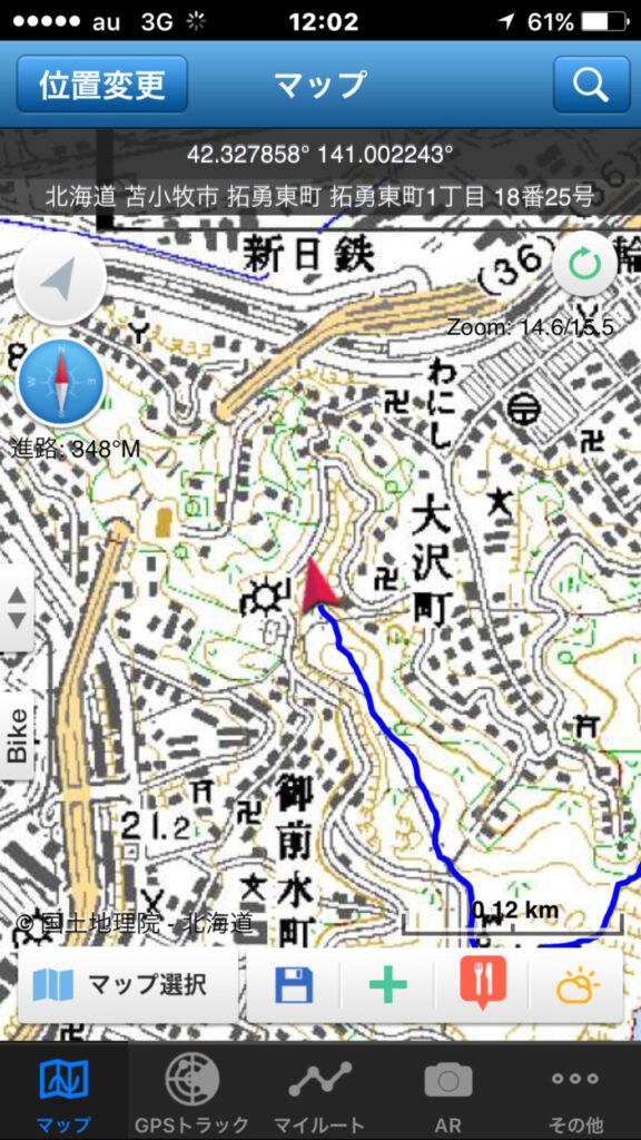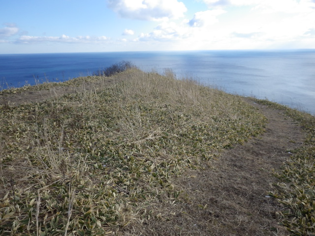 ▼やせ尾根でショートカット。まだ、追直漁港も行かねばならない。ホテルのチェックインは15:00にしていたが無理だ(+o+)
