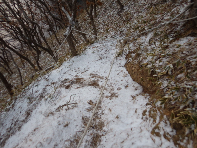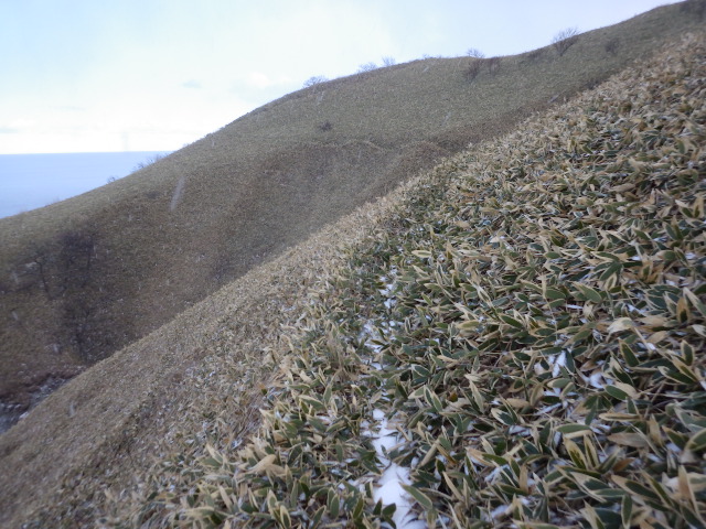 ▼雪が降ってきた。来た踏み分けは、怖いので笹の中をトラバーして戻る。