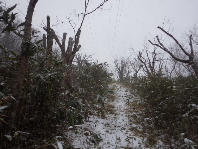 ▼吹雪になってきた。送電線の下のきつい登りを行く。アイゼンがあっても良いくらい。
