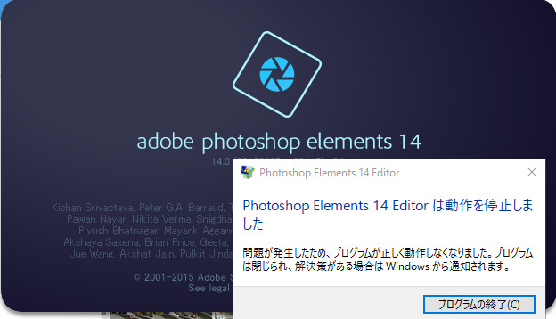 "Photoshop Elements 14 Editorは動作を停止しました"と表示され起動できず困っています(T_T) 2016 1/08 日常1 2016年1月8日2025年5月30日 再インストールしたり、 常駐プログラムを無効にしたり、 いろいろやってみたが ダメだ! とりあえず 寝よう(+o+) 日常1 初夢~辞令をもらう夢~ 今日の体調