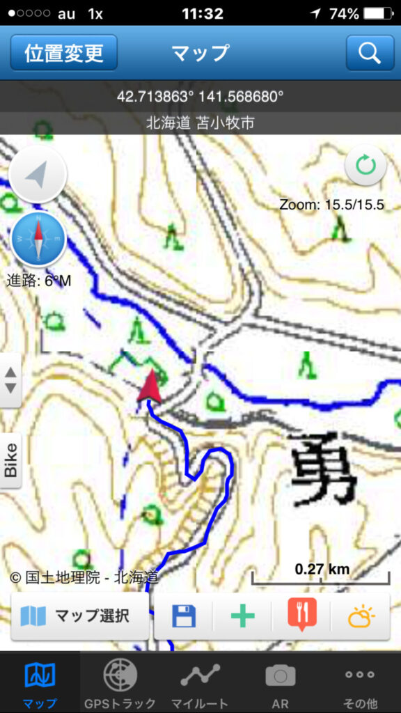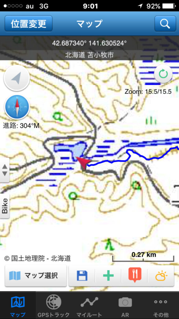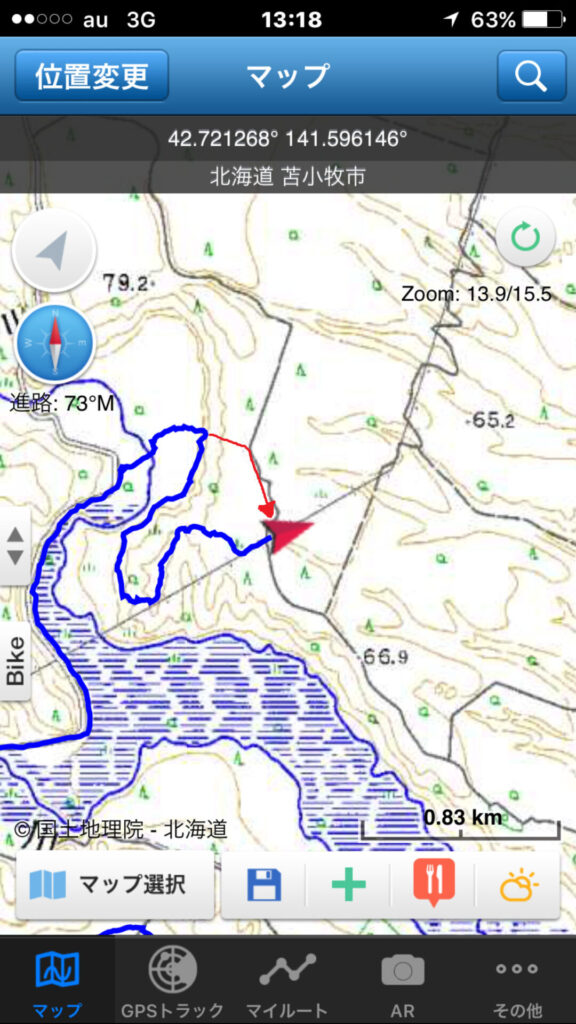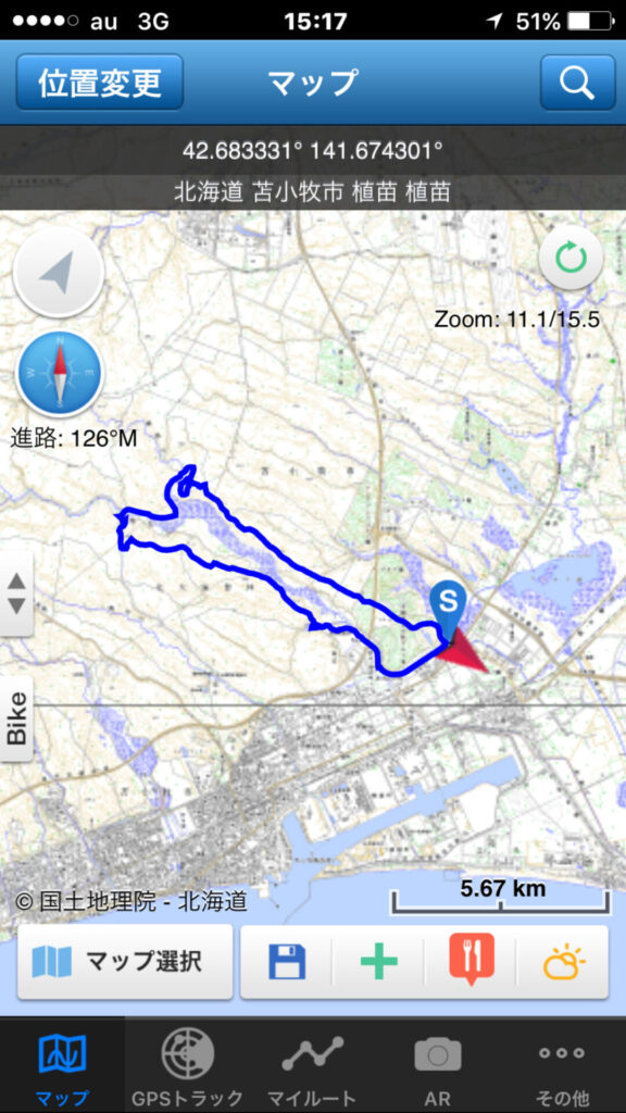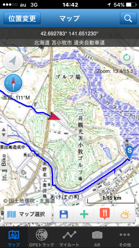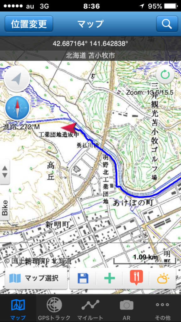 ▼位置の確認:いかに遠回りしたかわかる。(赤が当初の予定ルート)