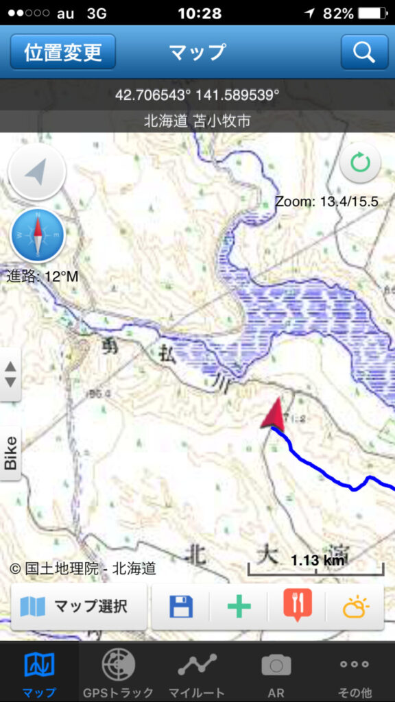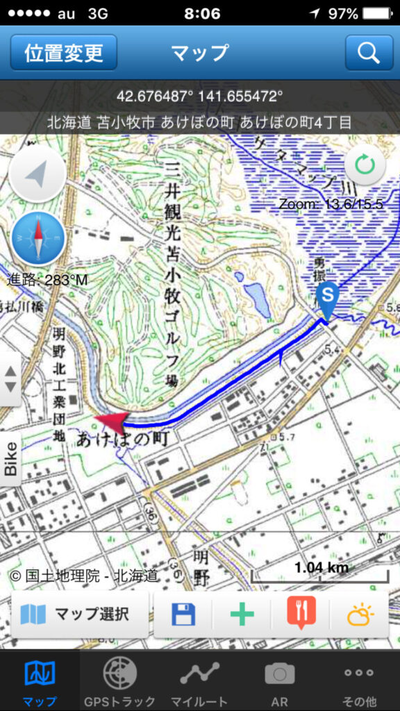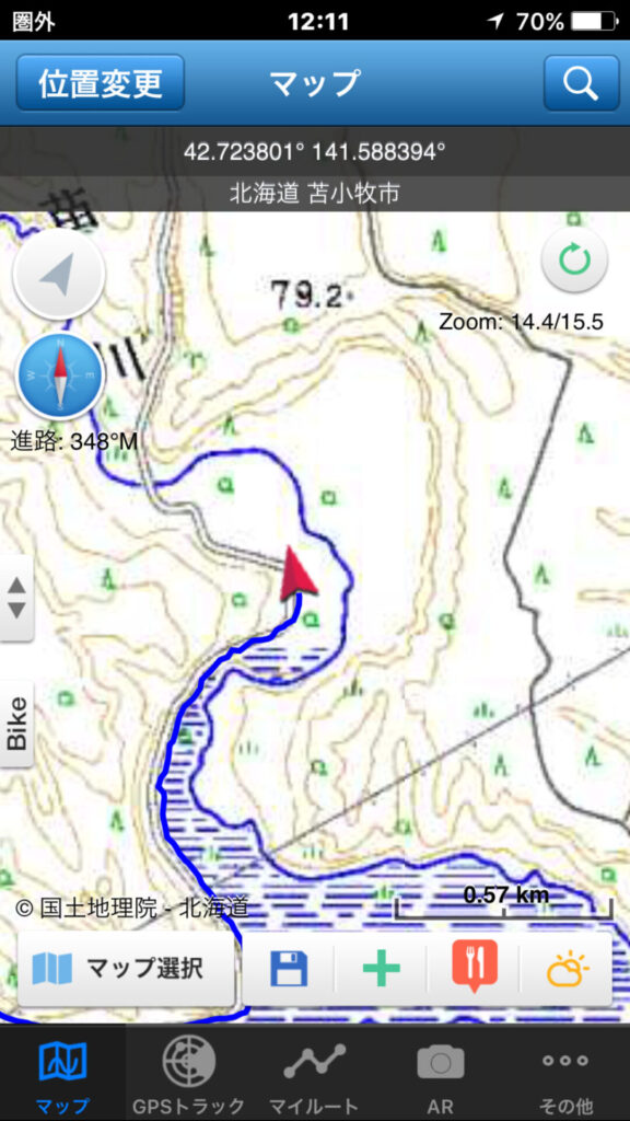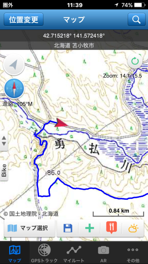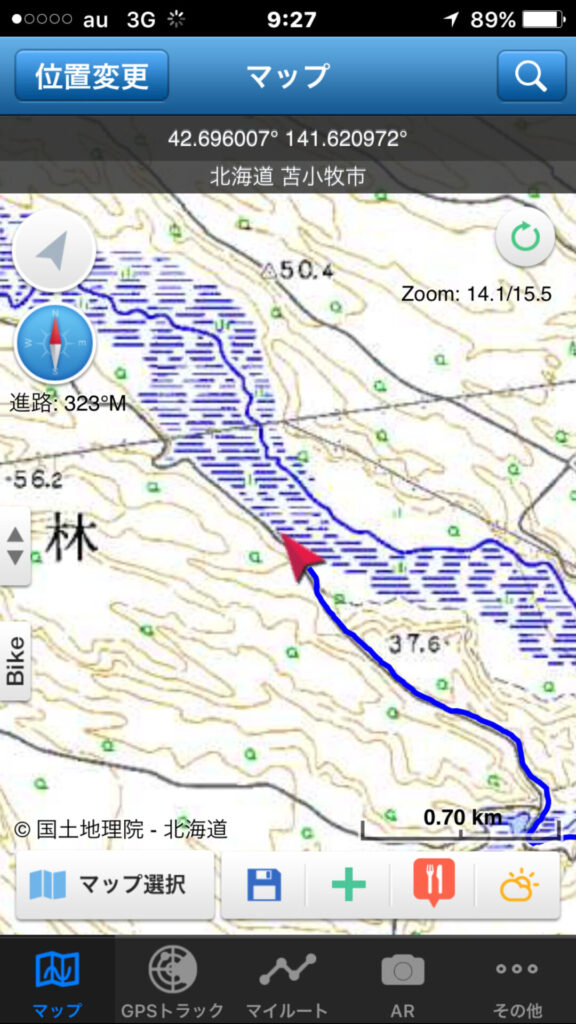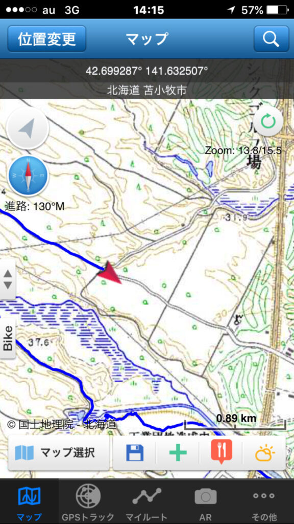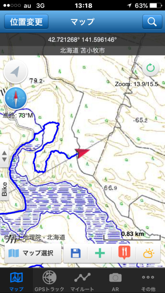 ▼位置の確認:いかに遠回りしたかわかる。(赤が当初の予定ルート)