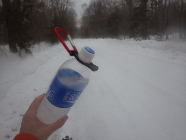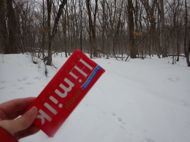 ▼この快適な除雪した道ともお別れ。チョコレートを半枚食べる。スノーシューを装着。