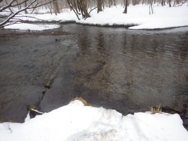 ▼植苗川に橋が無い、どうしよう! と思う前にスノーシューを履いたままジャブジャブ渡った。ゆっくりはしてられない。