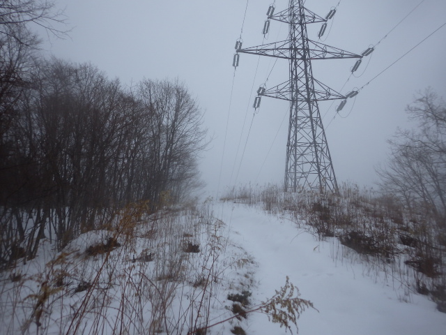 ▼迂回して高圧線したに戻った。鉄塔下は雪が特に深い、そして水を吸った雪は重い。あの鉄塔まで休み休み進む。