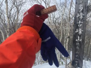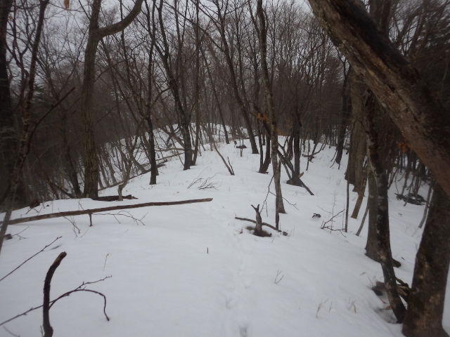 ▼と思ったら轍発見!ここを直登りすれば最短ルートだが…誘惑に負け、スノーシューを脱ぎ轍を歩く。