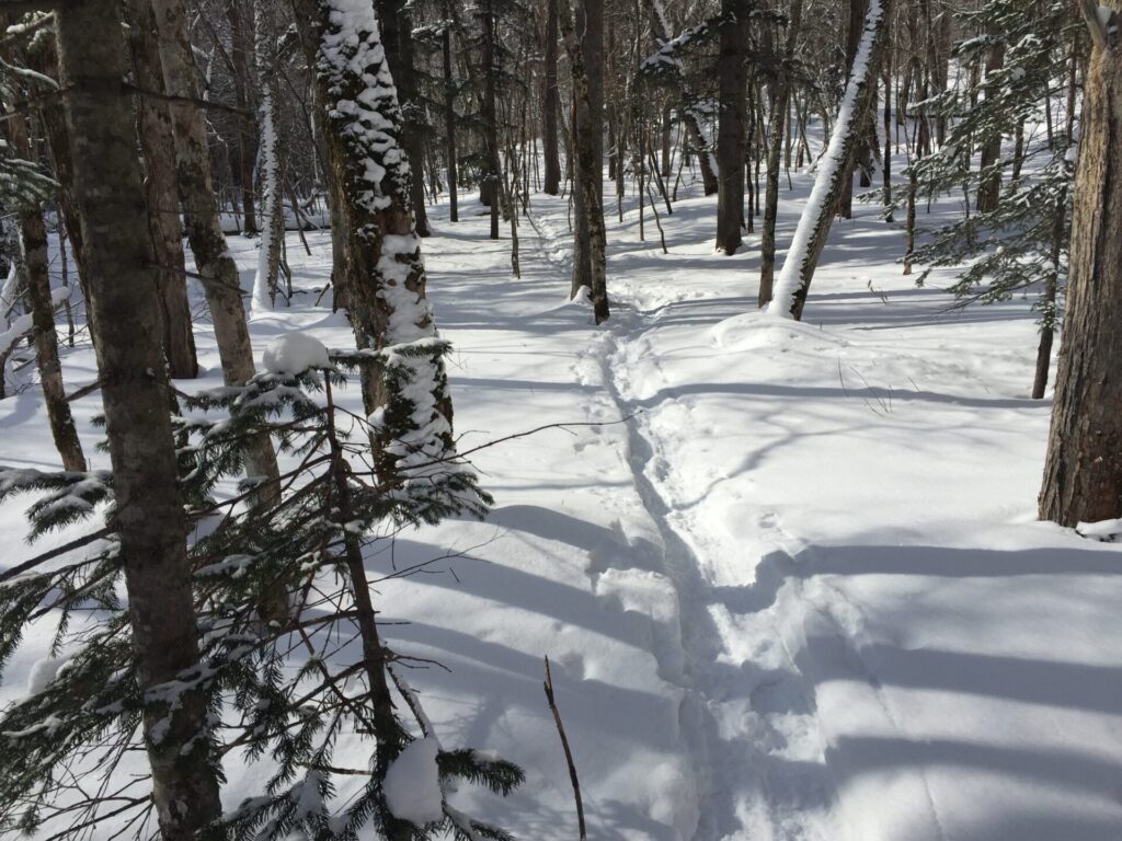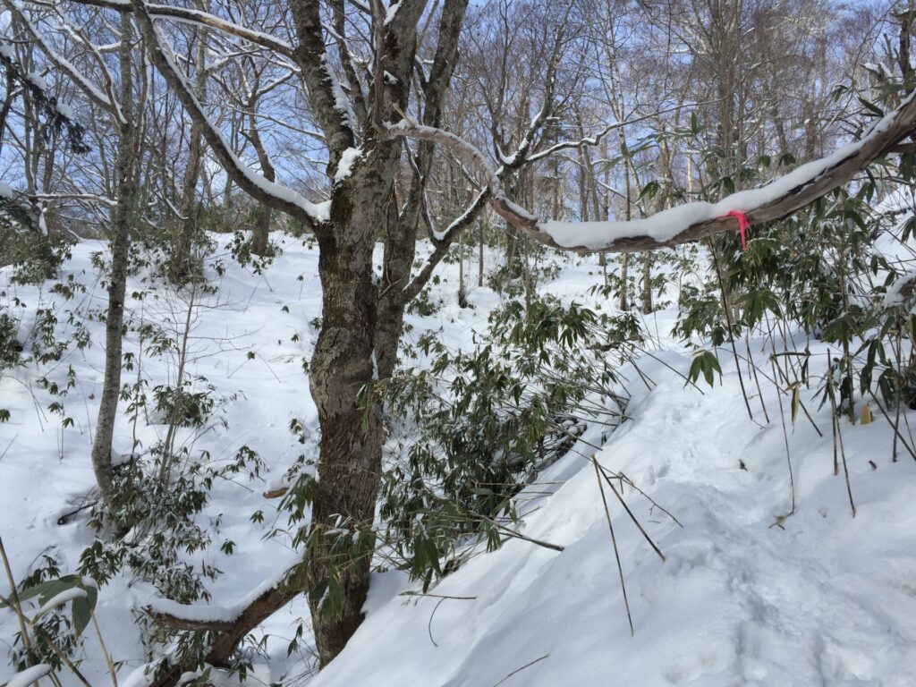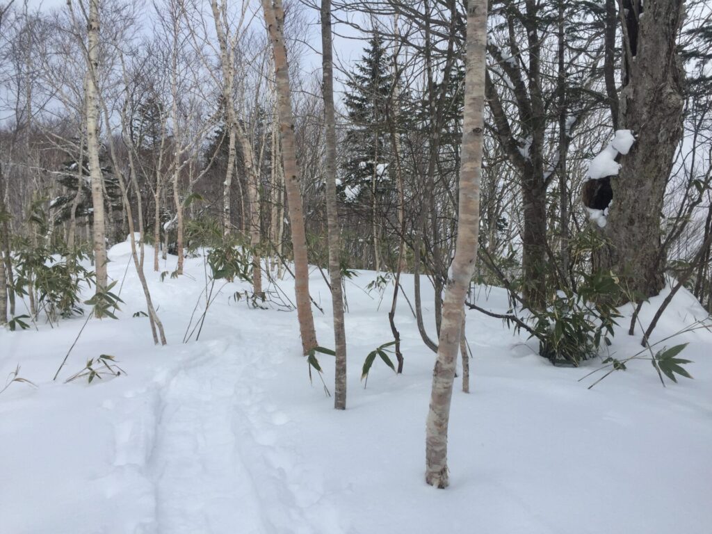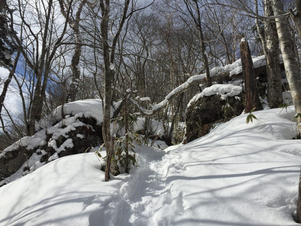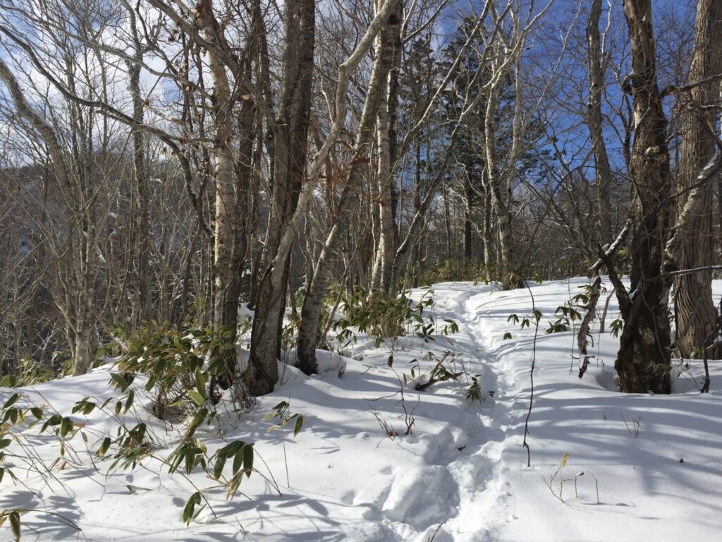▼森林に分け入る。確りトレースがあるのがうれしい。というよりトレースが無いなら帰ったかも。以外に人気のある冬用の山のうわさだったのでトレースは有ると思っていたが…