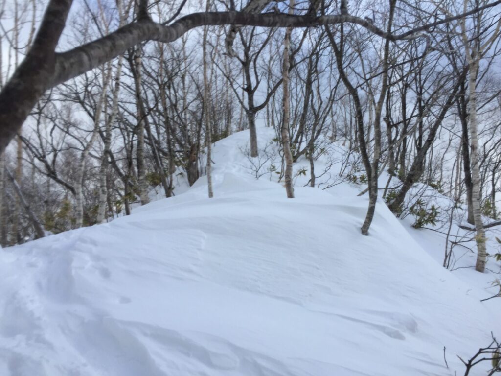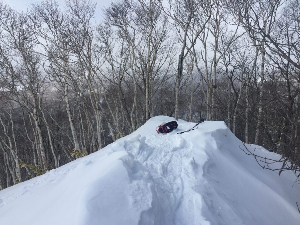 ▼頂上尾根にある足跡をたどってゆく。リュックデポした。