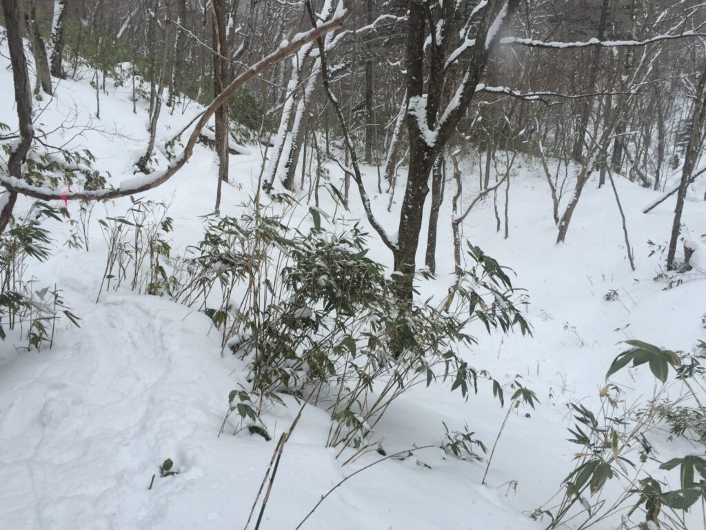 ▼それでも進んだら、もう急でかつ笹で無理。以外に近くに林道が見えたのだが…