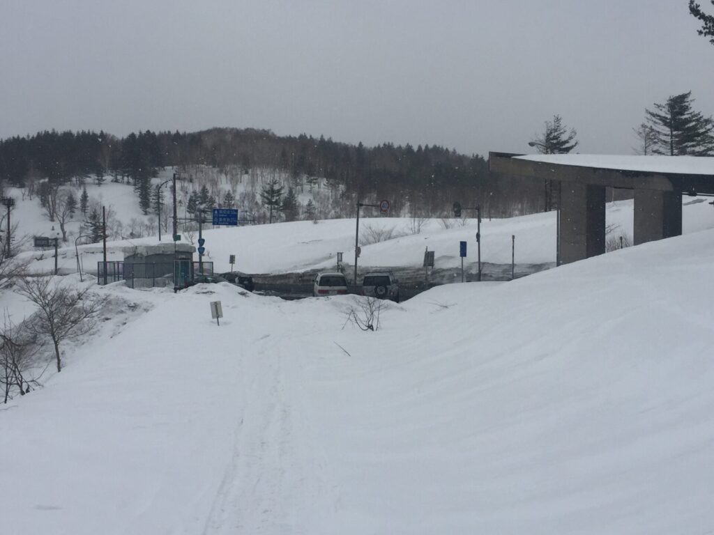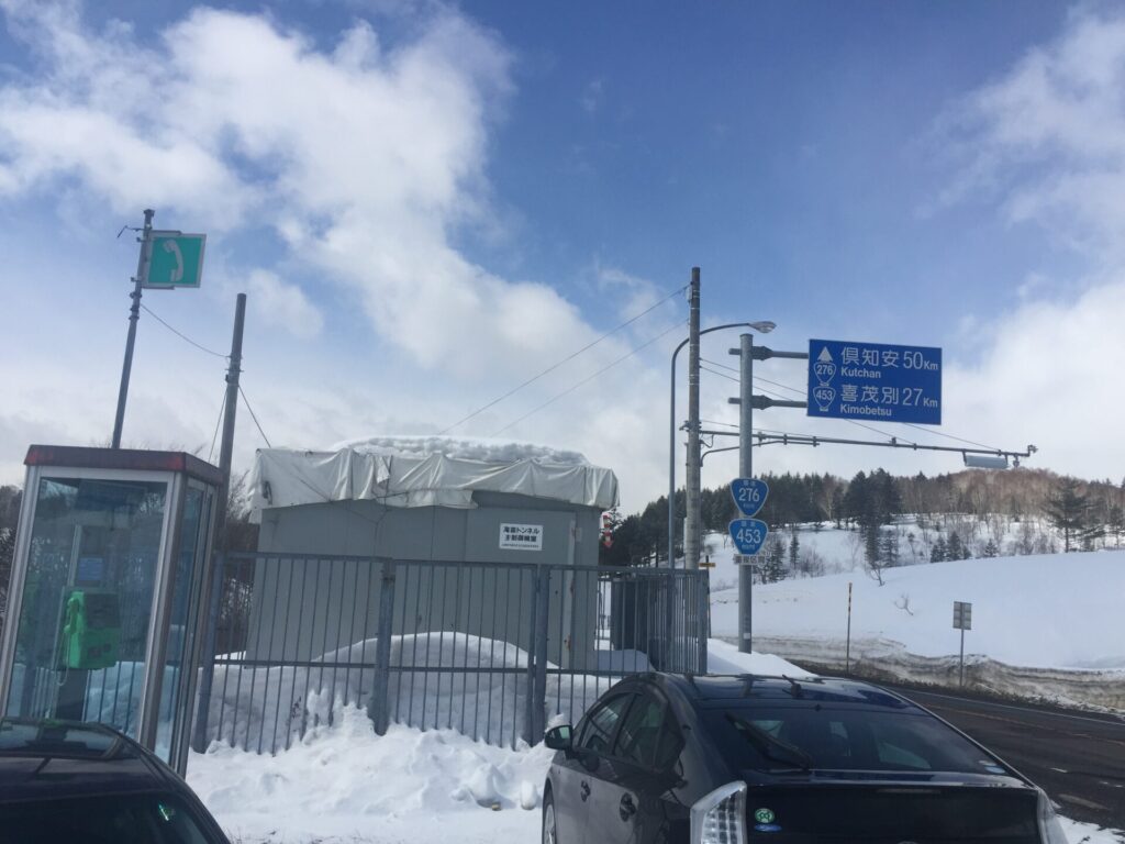 ▼滝笛トンネルの起点坑口にある駐車スペースに車を置いた。先客が3台、スノーモービルで入っているようだ。