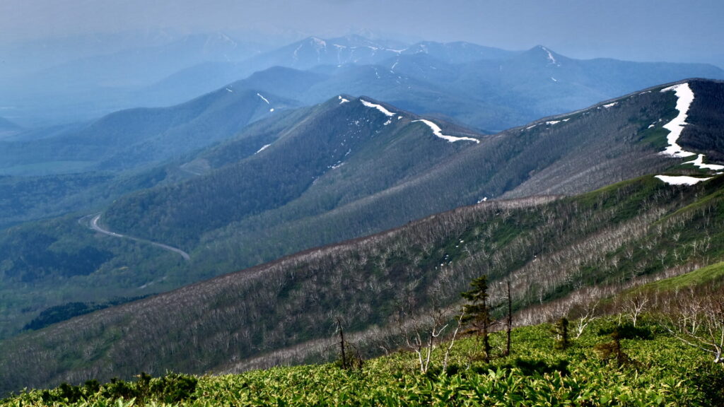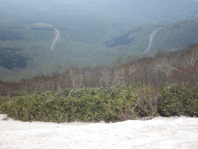 ▼尾根と国道38号。遠くに見えるのは夕張岳かな???