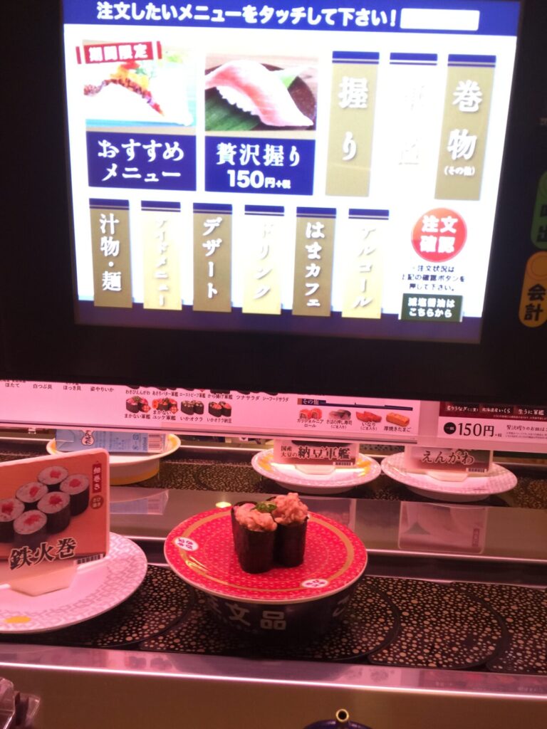 ▼回転レーンの向こうには職人さんがいない。上り下りのレーンとなっていて、他のお客さんが座っているのが見える。注文は、各席に固定で備え付けのタッチパネルで注文する。注文商品には、ご注文品の皿の上に載ってきて届くと、音楽とアナウンスで知らせてくれる。