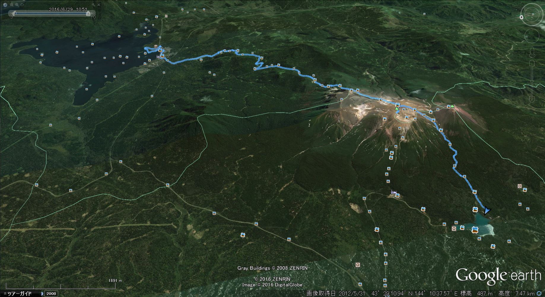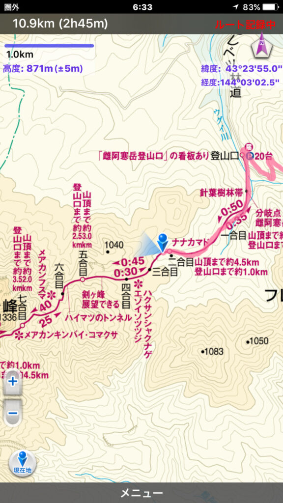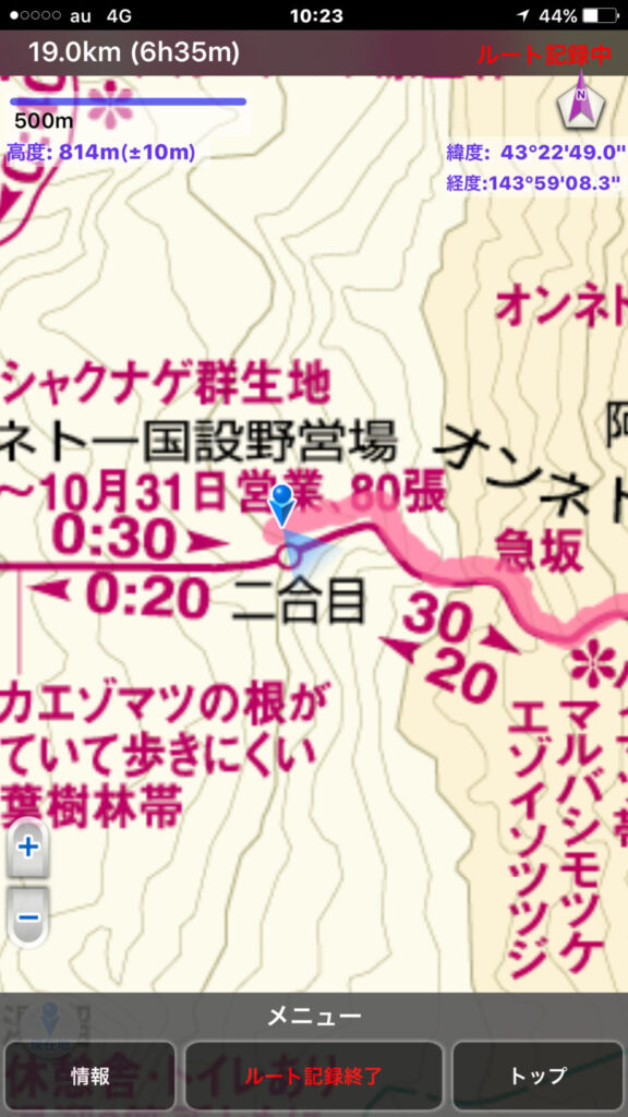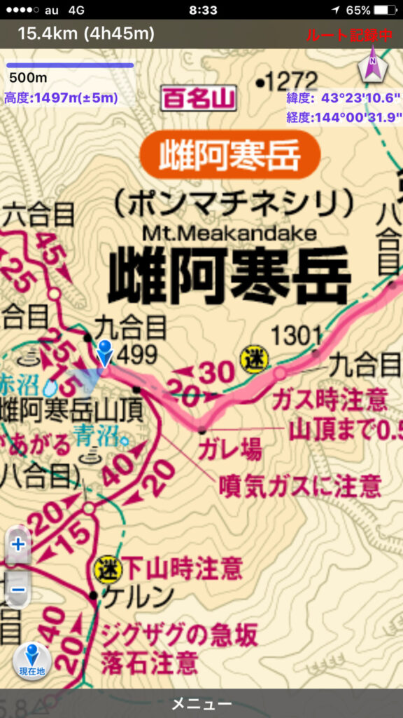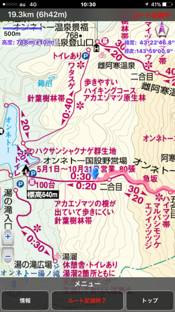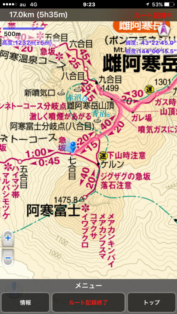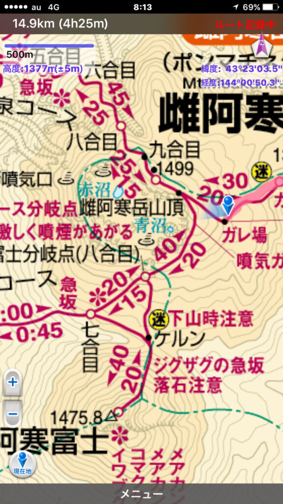 ▼位置:1時間20分のところ50分で走破。かなり飛ばしている!あとが心配だが…寝坊の遅れを取り戻そうとしている。雌阿寒岳の山頂で”マスター・オブ・どんぐり”と8時に待ち合わせだからだ!