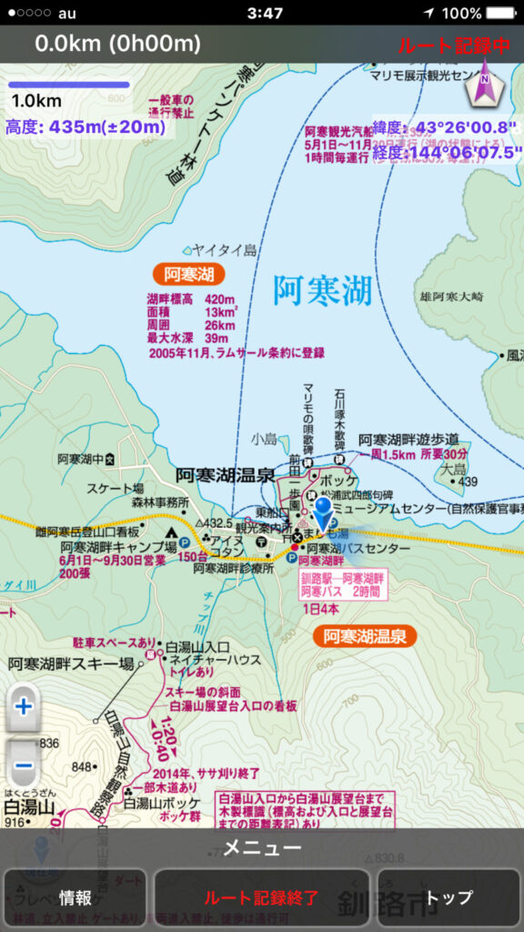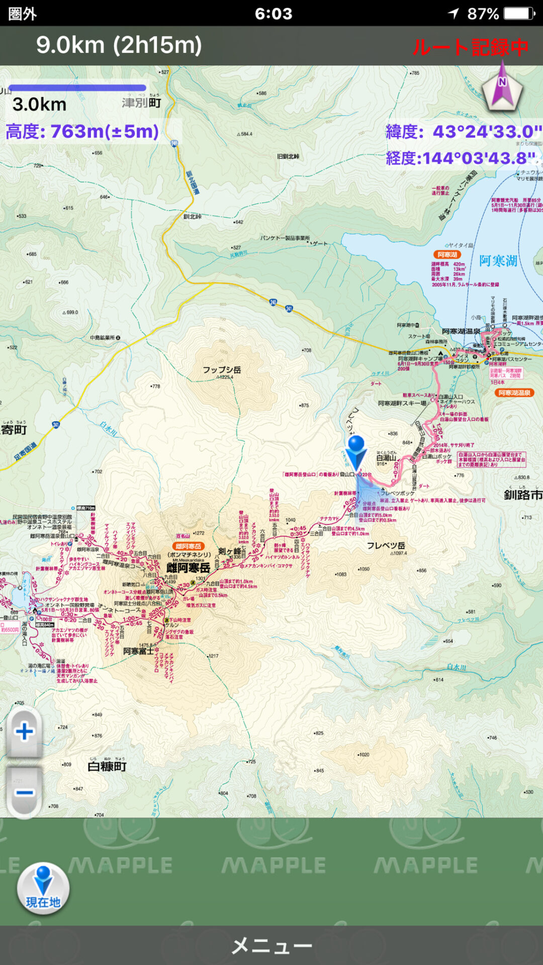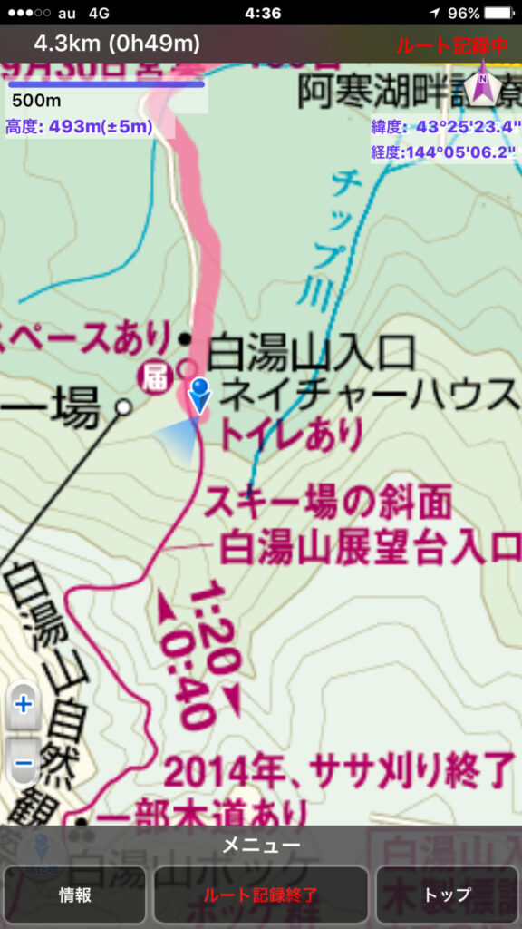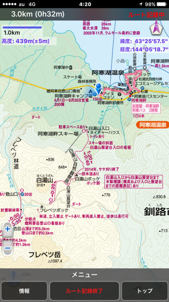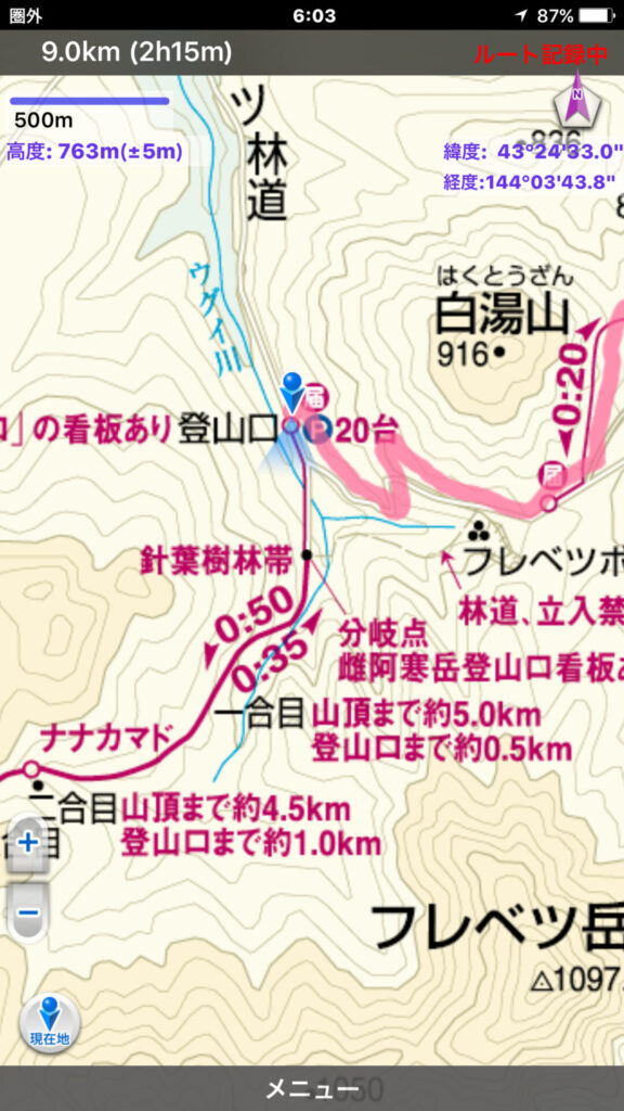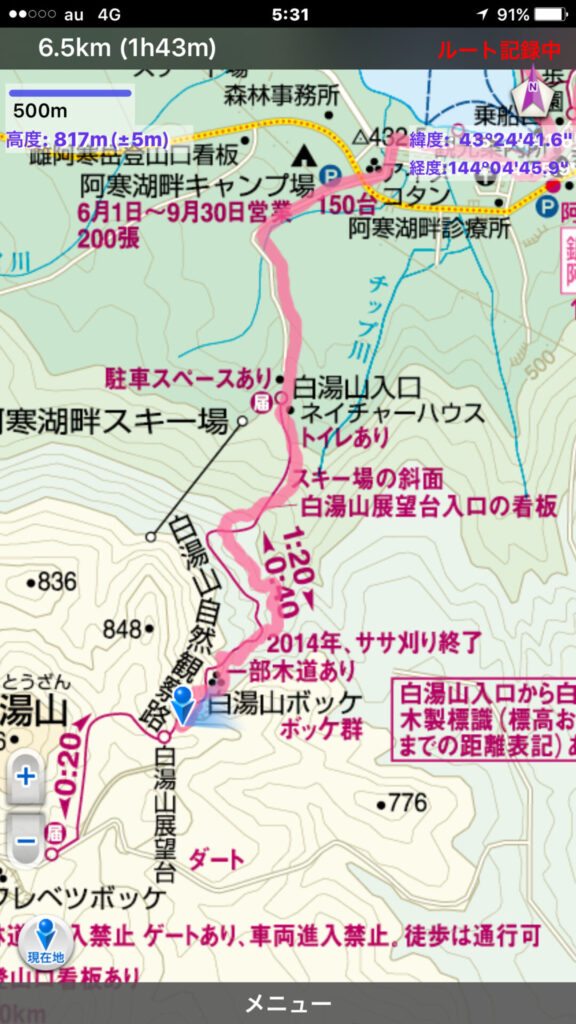 ▼位置:1時間20分のところ50分で走破。かなり飛ばしている!あとが心配だが…寝坊の遅れを取り戻そうとしている。雌阿寒岳の山頂で”マスター・オブ・どんぐり”と8時に待ち合わせだからだ!