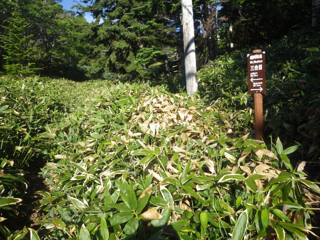 ▼三合目:笹かぶりが激しさを増す! 朝露でビショビショ
