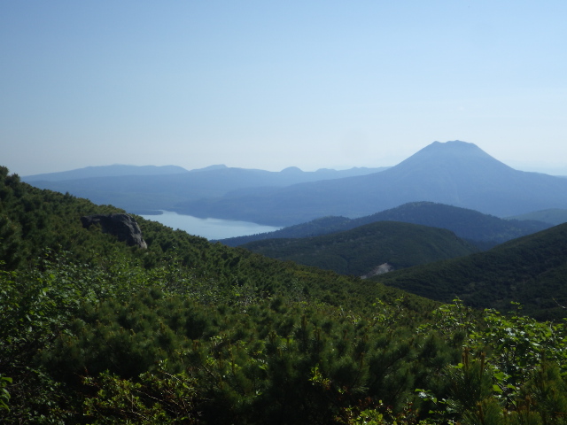 ▼雄阿寒岳と阿寒湖 あの湖畔から歩いてきたとは自分でも信じられない。