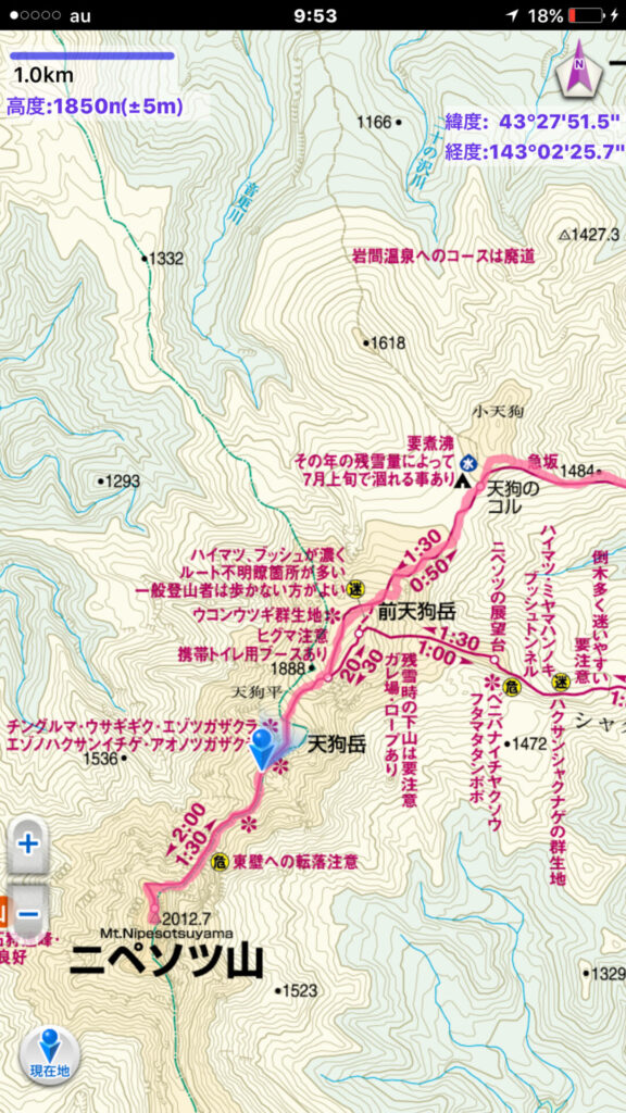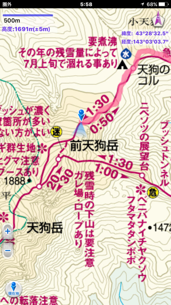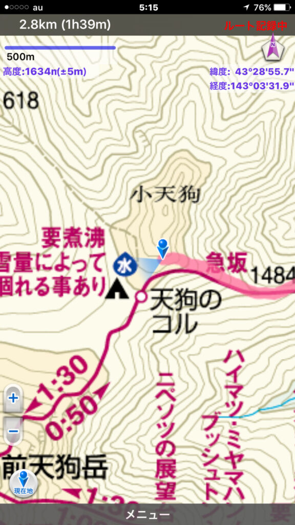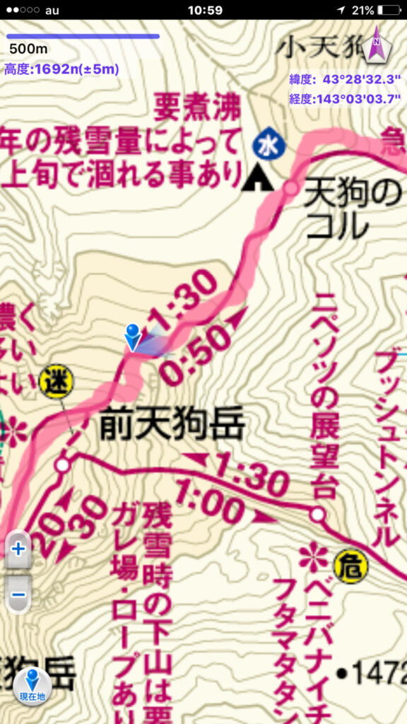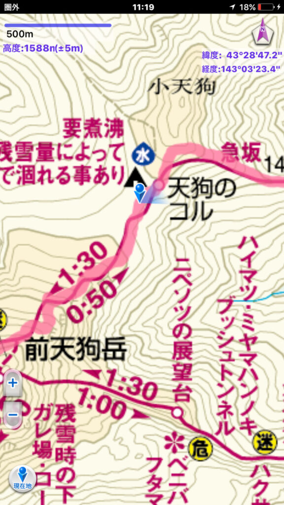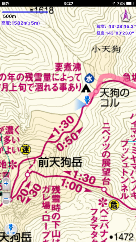 ▼位置:テント場のあたりを天狗のコルと表示している。