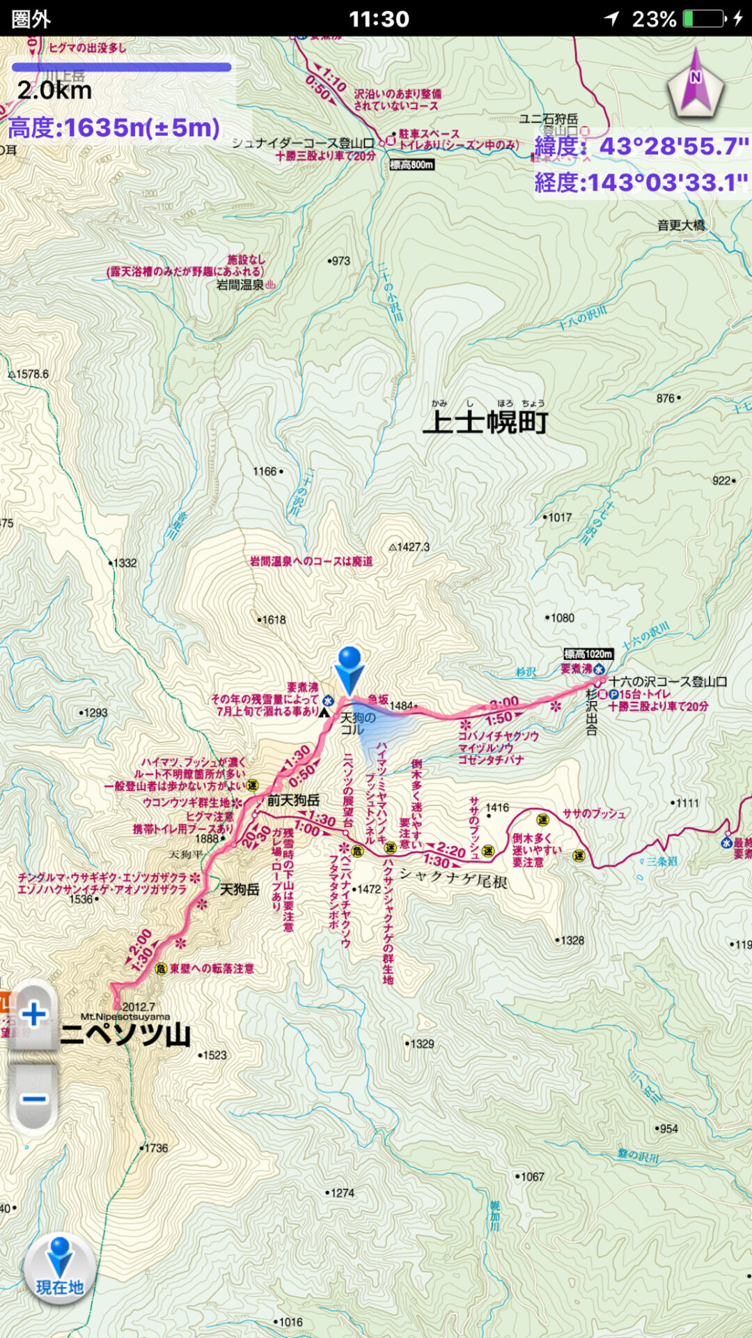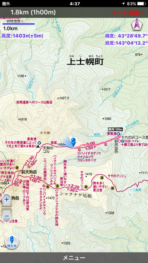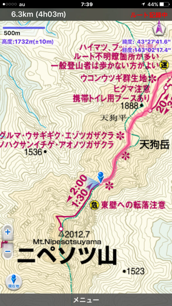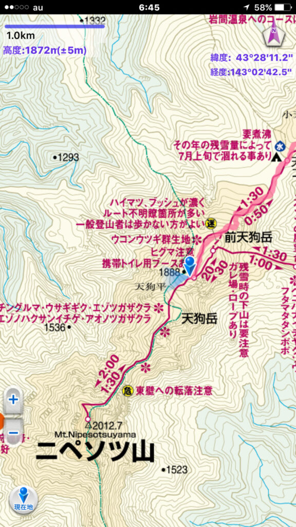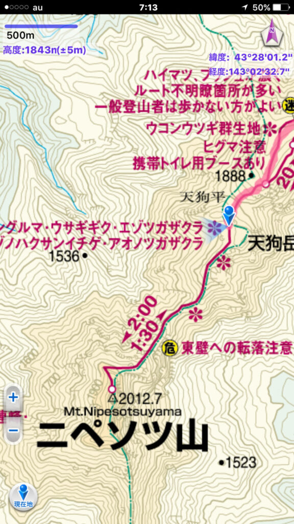▼位置:テント場のあたりを天狗のコルと表示している。