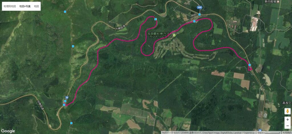 ▼本日の計画ルート:狩勝峠の頂上から国鉄根室本線の通称狩勝線の廃線跡をたどる。勾配2.5%ピッタリに敷設された鉄道ルートは、見事な幾何学的な半円形の連続だ!