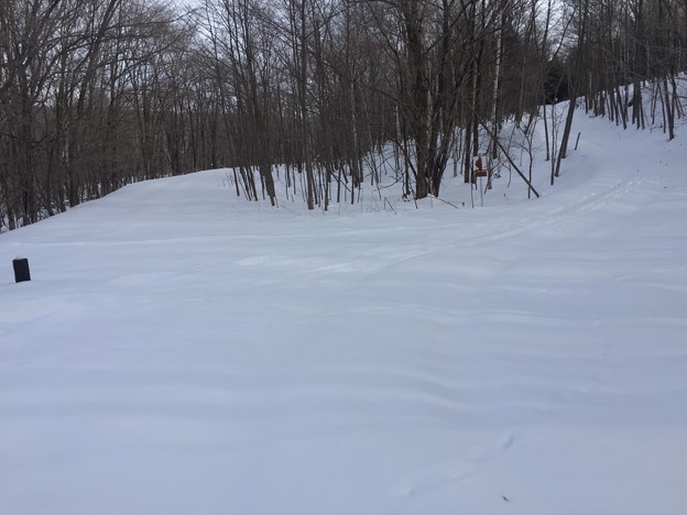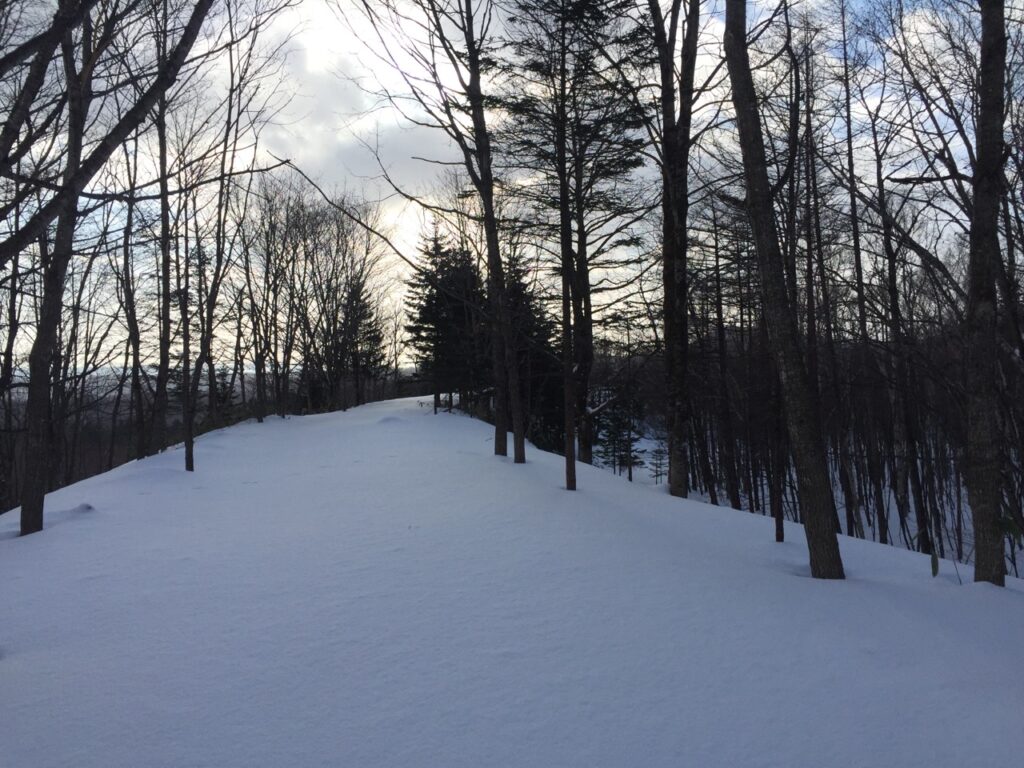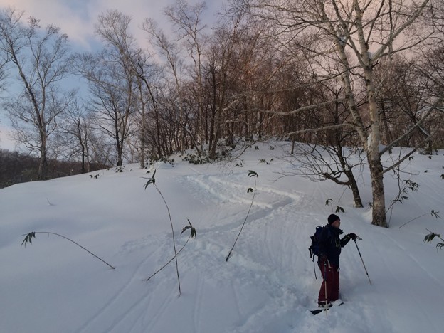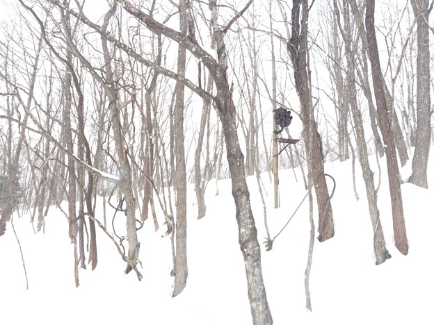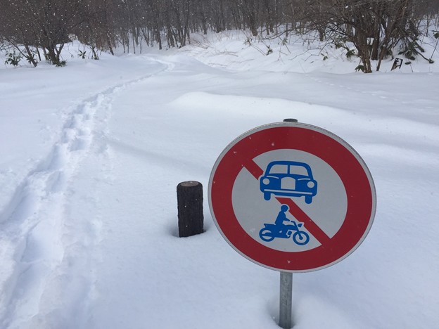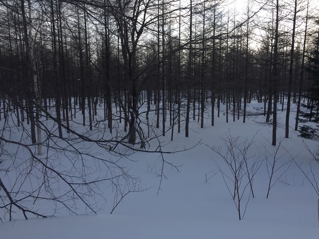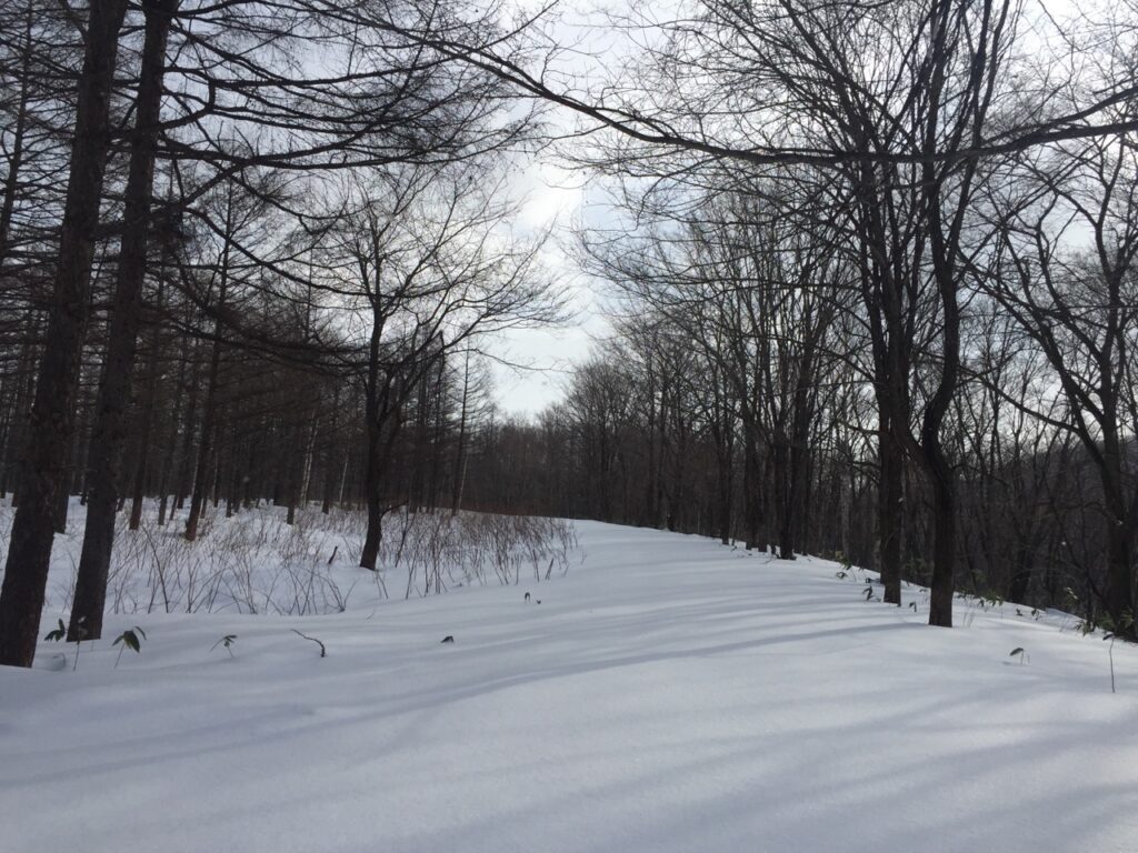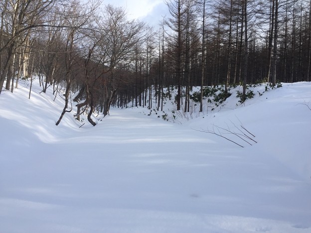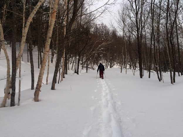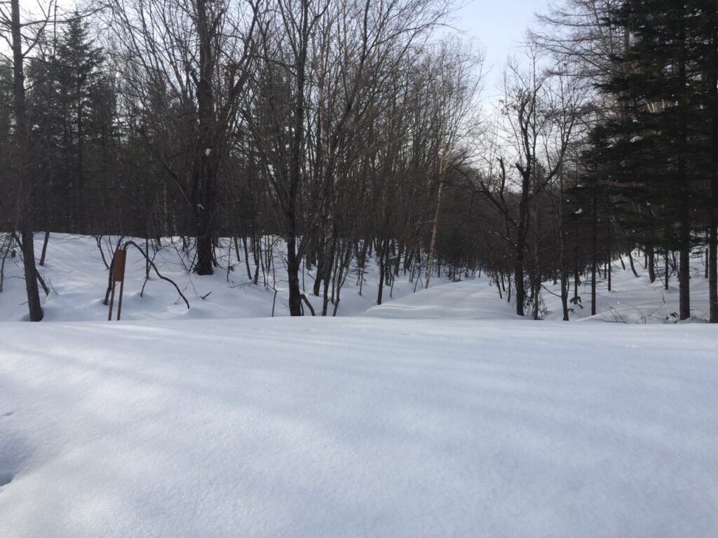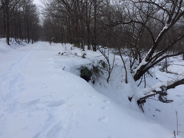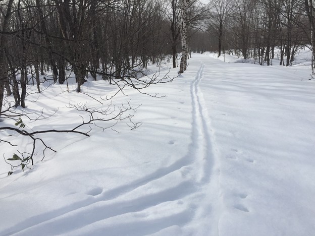 ▼スキー跡があって、少し楽になるかと安心したとたんに、また森の中へスキー跡は消えていった。