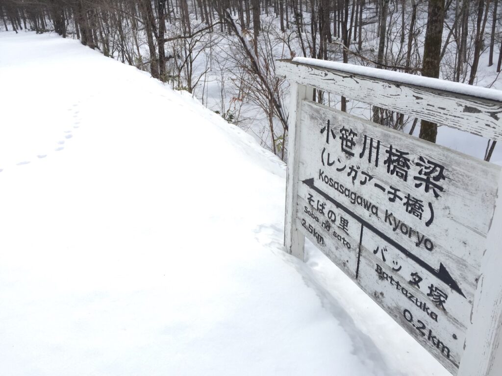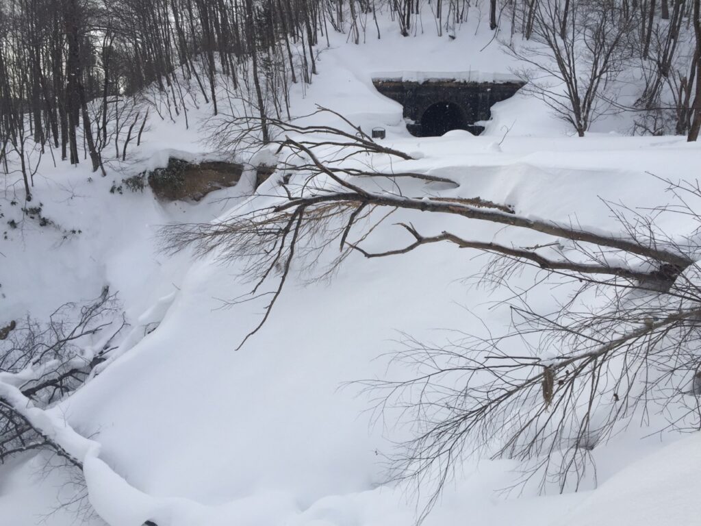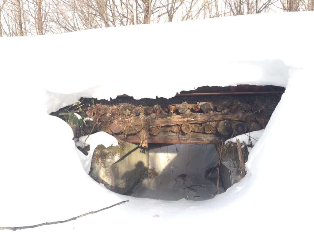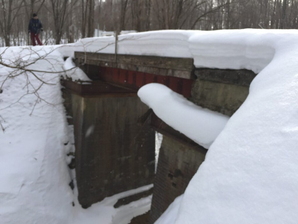 ▼鉄道時代は丸太を重ねた橋だったのだろう。その後、型鋼を載せ自動車が通れるように補強したのか?その厚さ分、フォーメーションが高いので雪の中でも何かあると気が付いた。