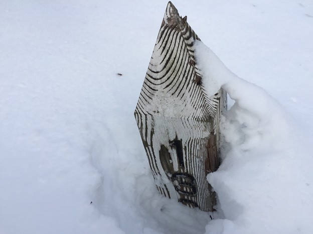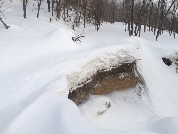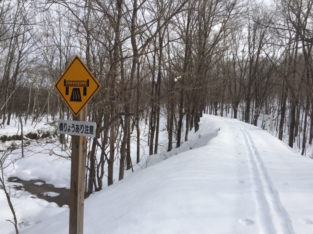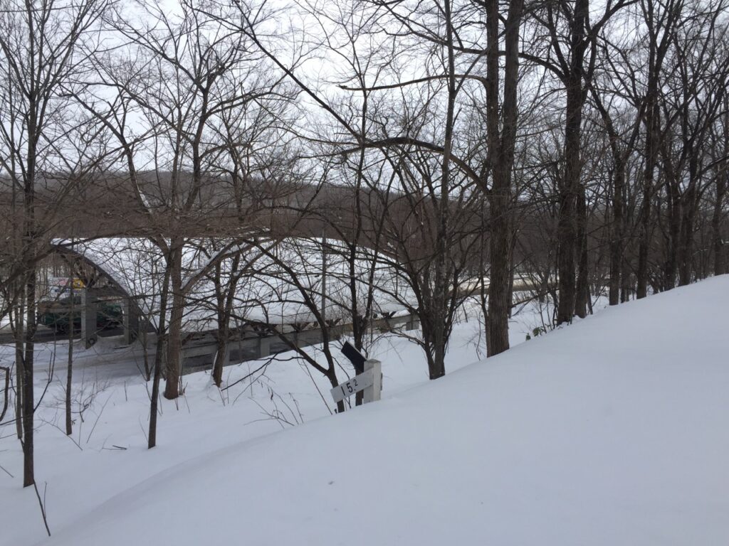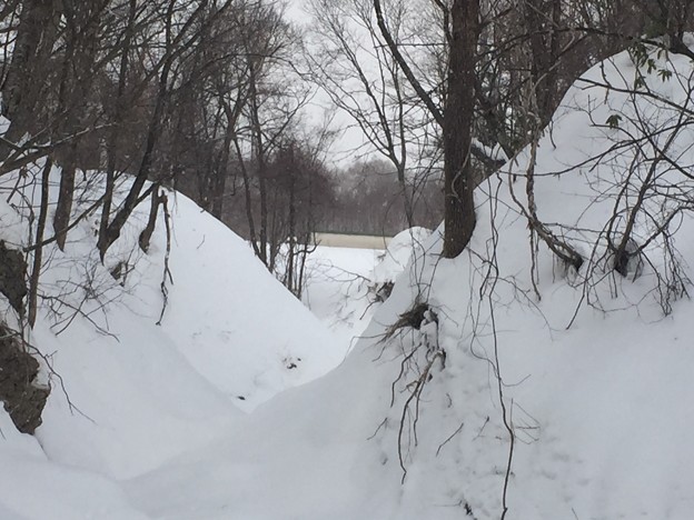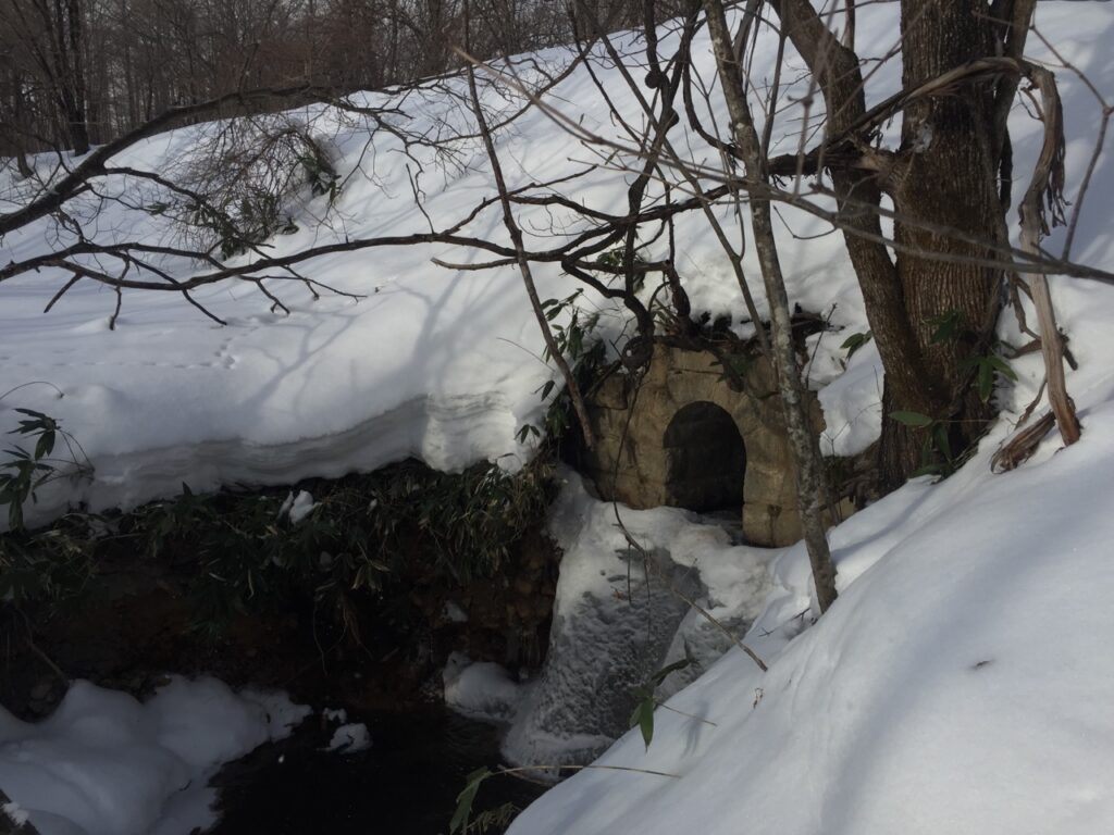 ▼鉄道時代は丸太を重ねた橋だったのだろう。その後、型鋼を載せ自動車が通れるように補強したのか?その厚さ分、フォーメーションが高いので雪の中でも何かあると気が付いた。