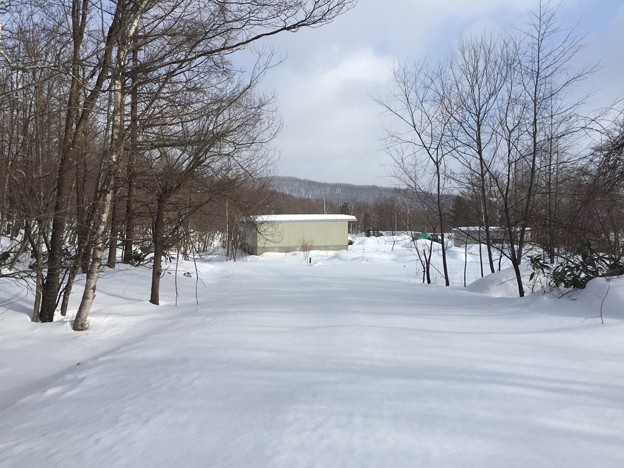 ▼ゴルフ場の車庫が見えてきた。いったんスノーシューを脱ぐ。