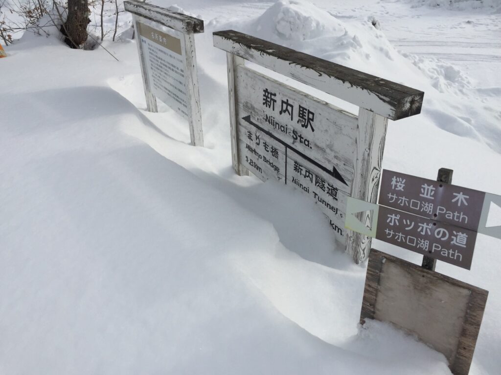 ▼スノーシューを再装備し新内駅から再開。あと4km!