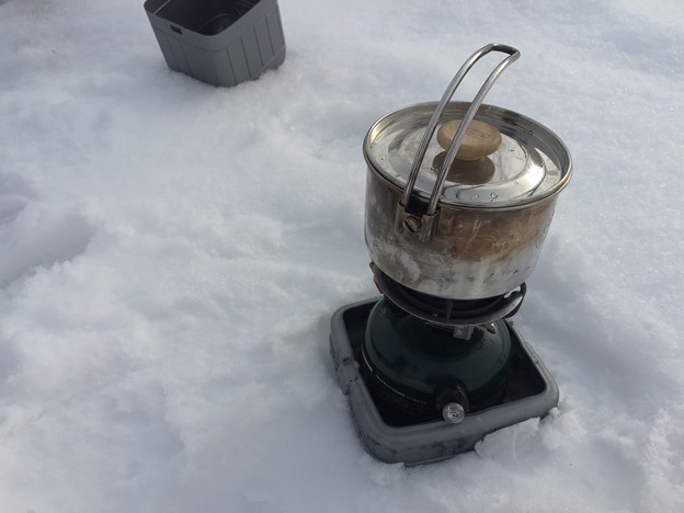 ▼前回の狩勝岳での失敗から、ガスではなくホワイトガソリンでお湯を沸かす筋肉さん。