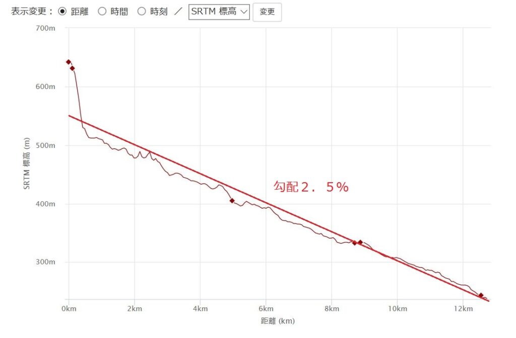 ▼実際に歩いた標高グラフに勾配2.5%のラインを入れてみると