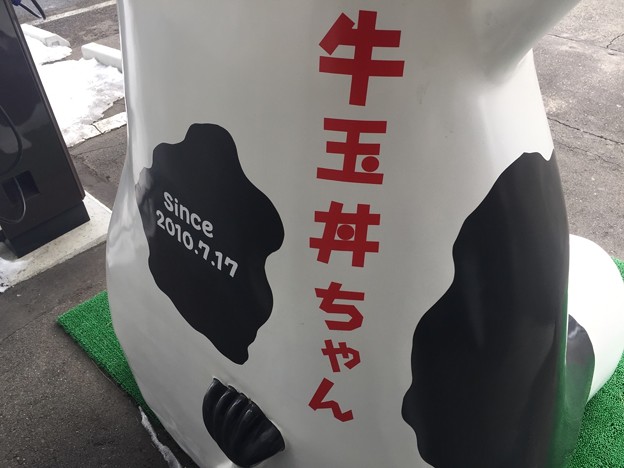▼食べ終わって店頭にてマスコット「牛玉丼ちゃん」の背中 since_2010.7.17とある