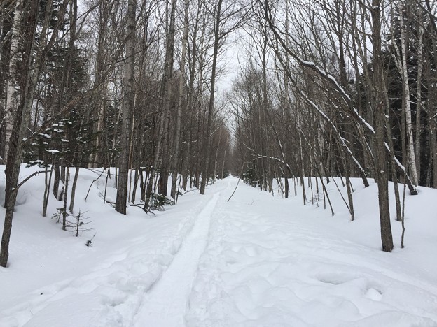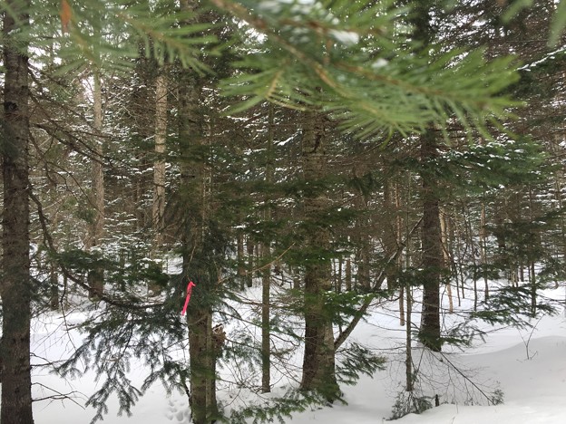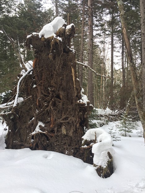 ▼雪も深く、倒木が多いので進みにくい。鹿の足跡をトレース。