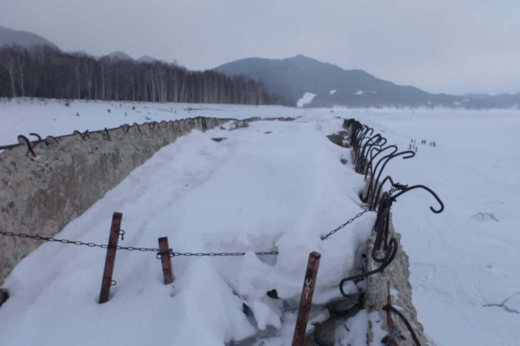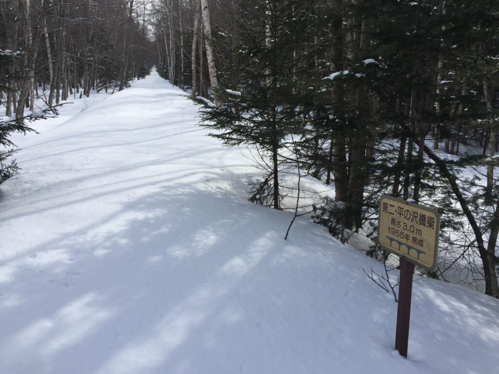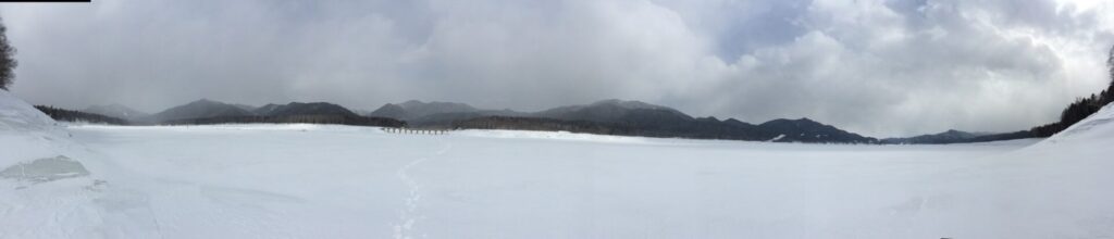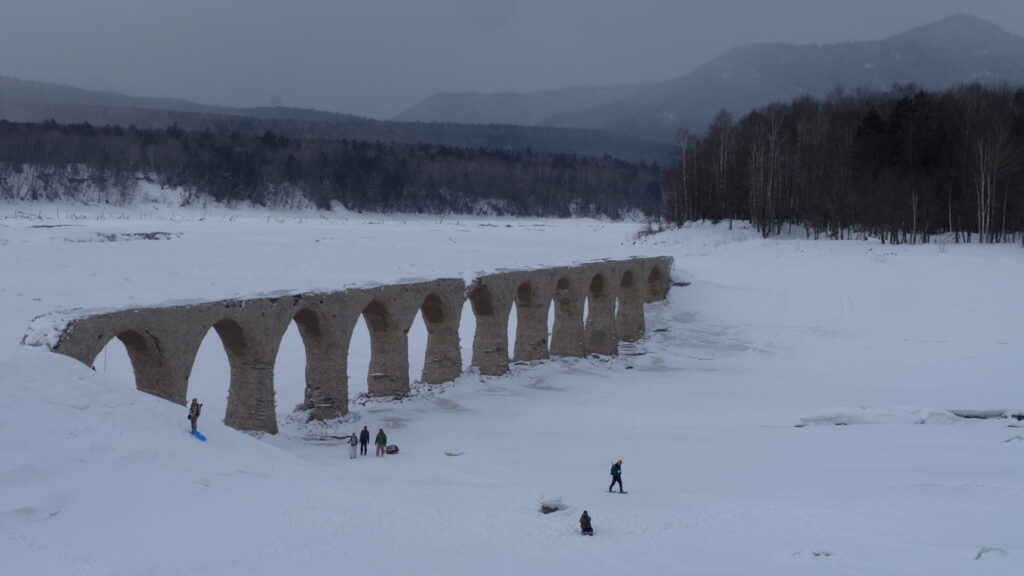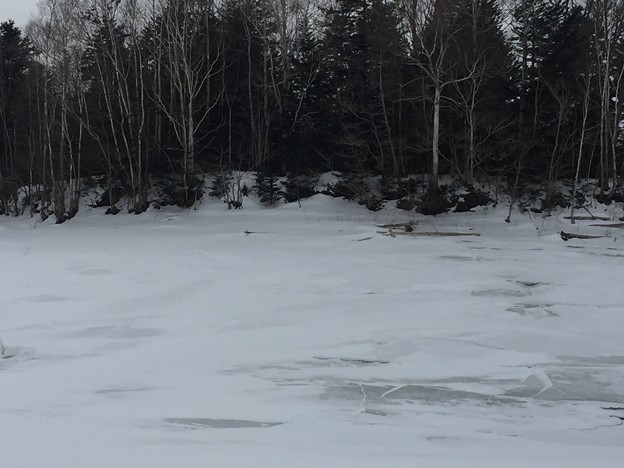 (1)タウシュベツ川橋梁から真西は氷が融けているので、湖畔と国道が接近している付近からはいけない。