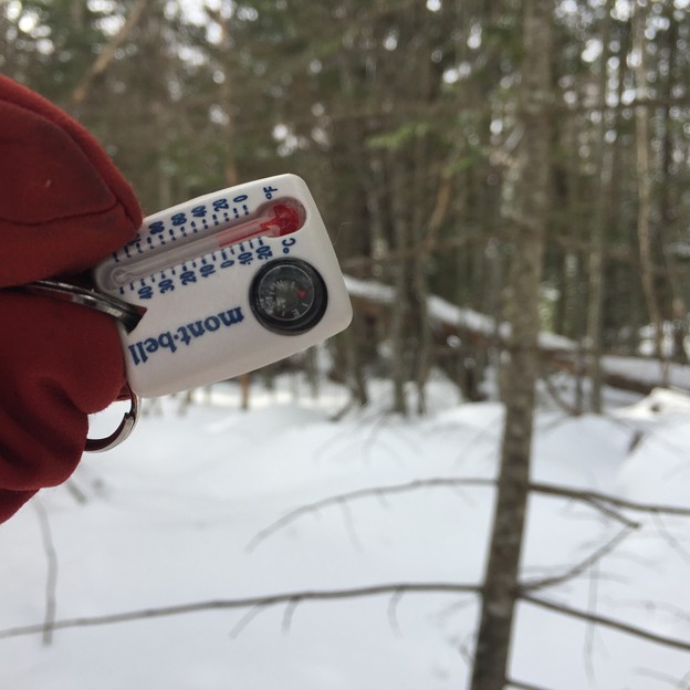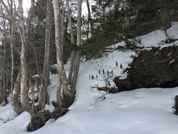▼湖の満水時の高さ付近が、直立の岩になっている。スノーシューを脱いで、樹木を掴んでやっと上る。