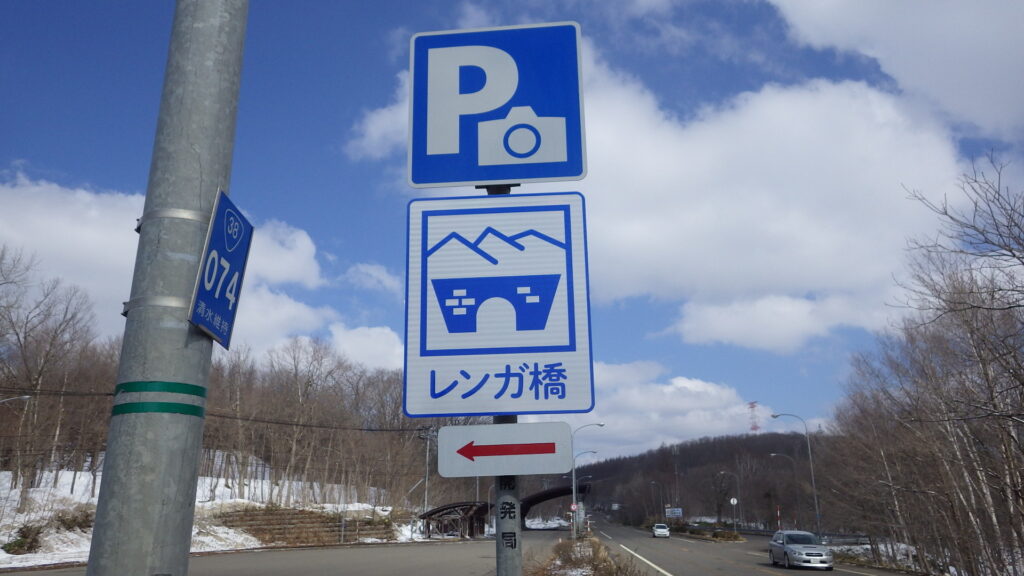 ▼昨日設置された真新しい「レンガ橋」の案内看板