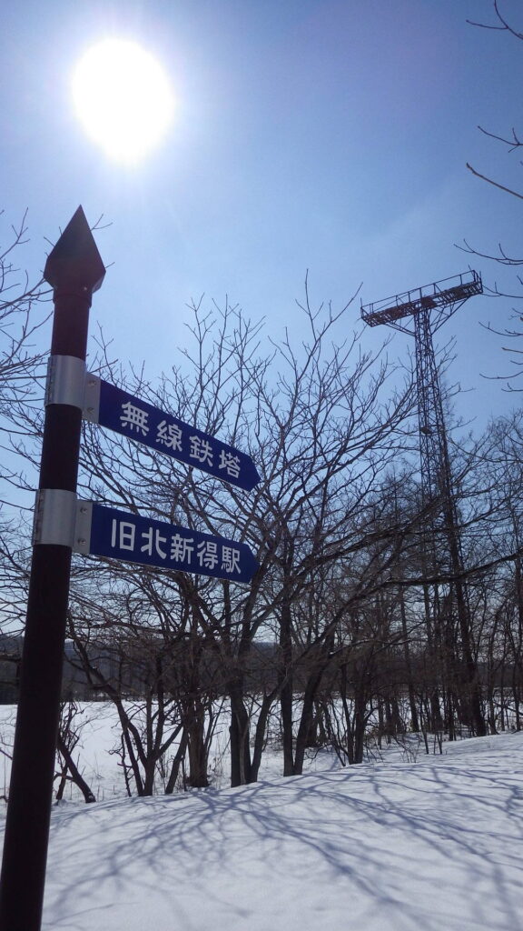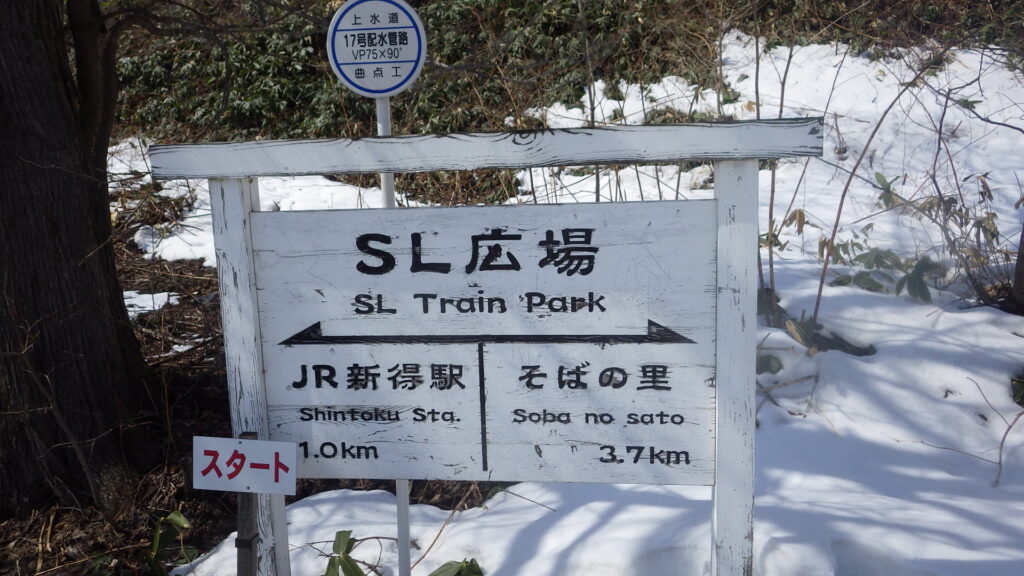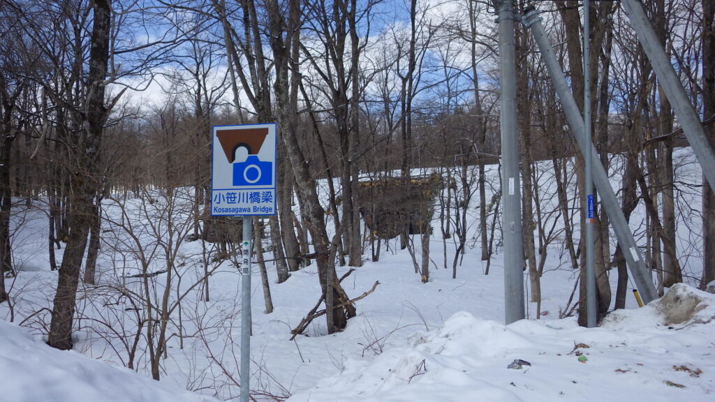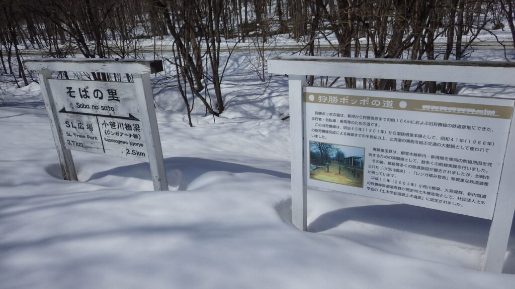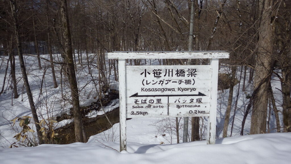 ▼廃線跡に這い上がると、「小笹川橋梁」の標識あり。南に向かって歩く。最初は坪足だったがスノーシューを装着