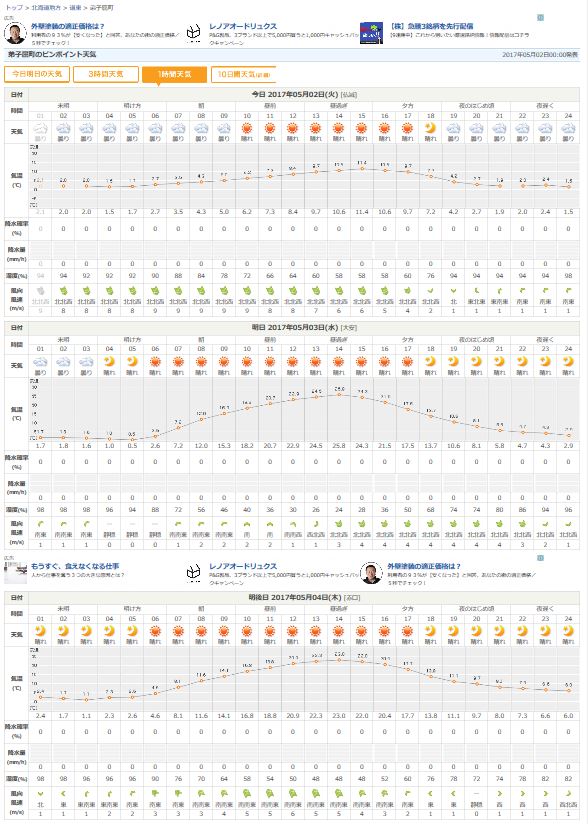 ▼弟子屈の天気をチェック。5/4の風の強さが気になる。