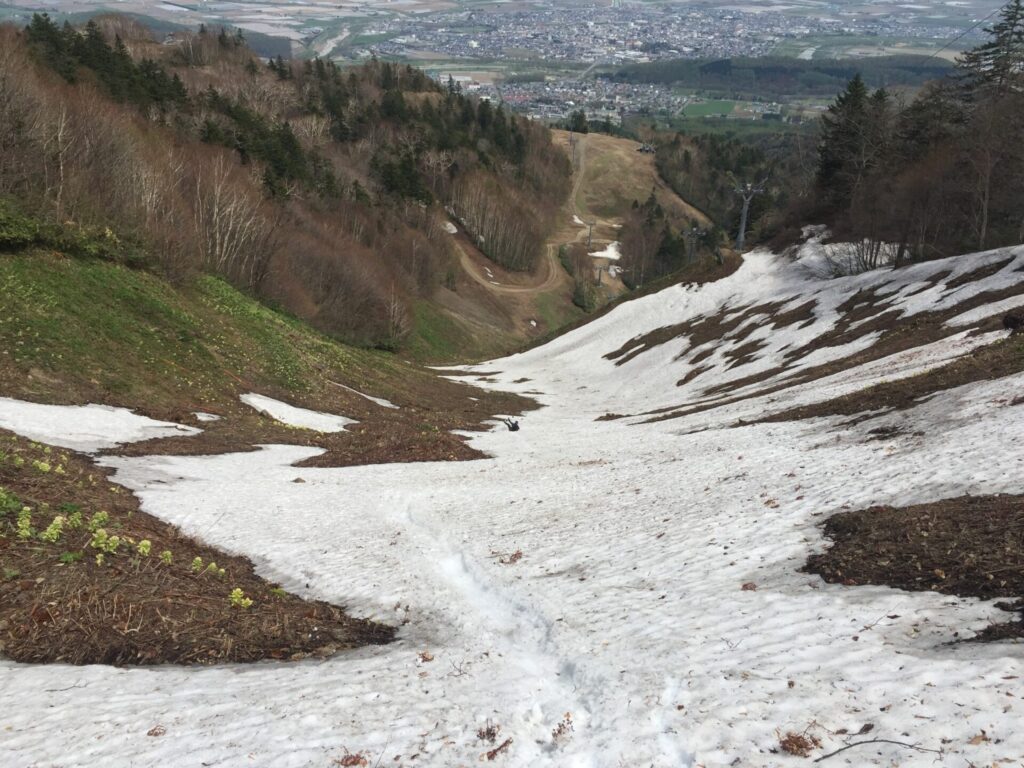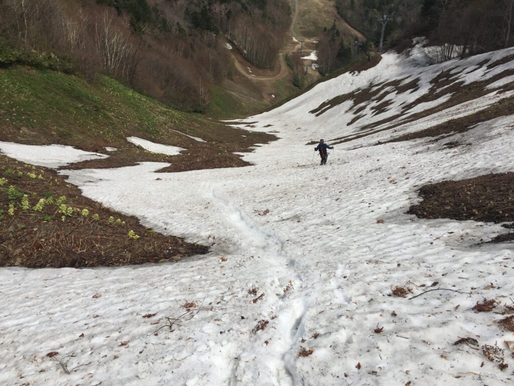 ▼雪の残った北の峰ZONEゲレンデを一気に下る。