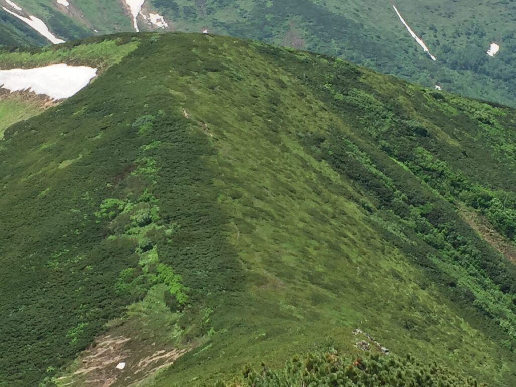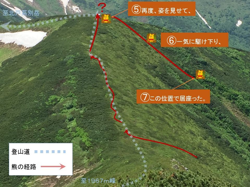 ▼クマが頂上のテント場から現れ、のり面をすごい速さで駆け下った。