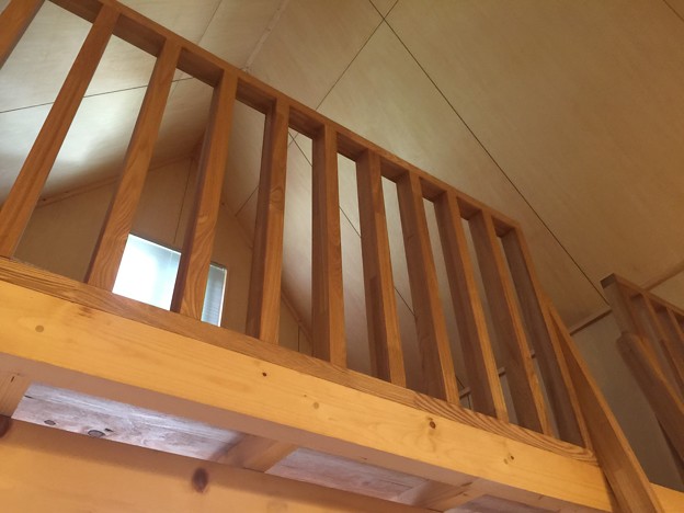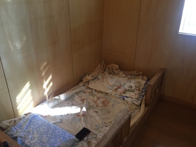 ▼室内にはロフトがあり、下にはベット2床、ロフトには布団2組の計4人が寝れる。4人分の寝具
