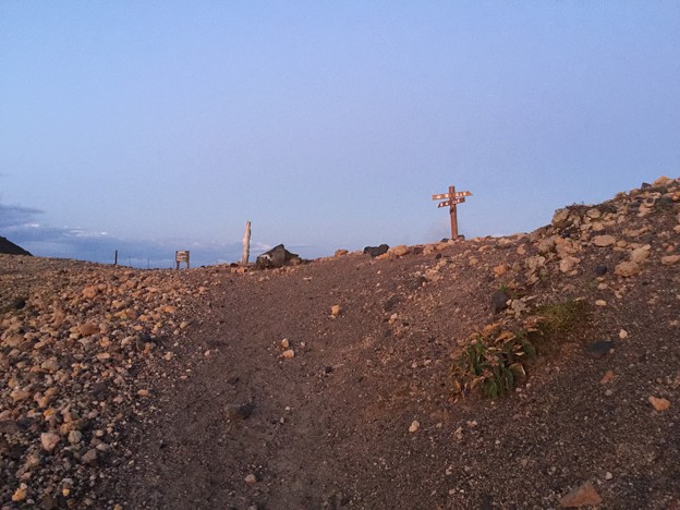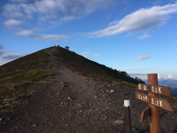 大平洋へ向かう錦岡コースは、ここから南へ下るが分岐が不鮮明。尾根下りのあと林道歩きが3時間ぐらい、ひとりだと熊が怖い。