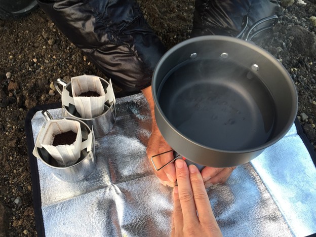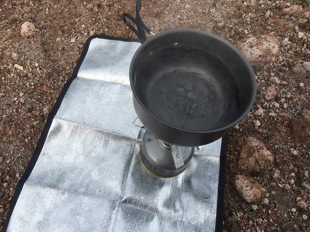 ▼ガスバーナーは、気温低下で能力も低下。手で温める。少し沸騰してきた。