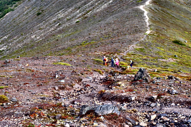 ▼登山道上で露岩しているところは、北側が直に落ち込んでいるので注意だ。子ども連れが多いので注意が必要!