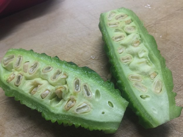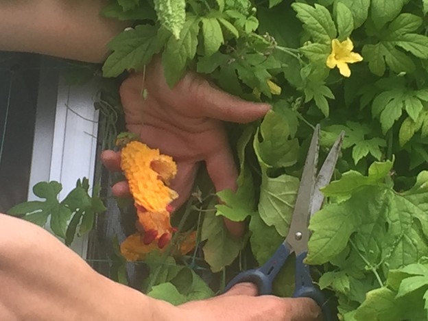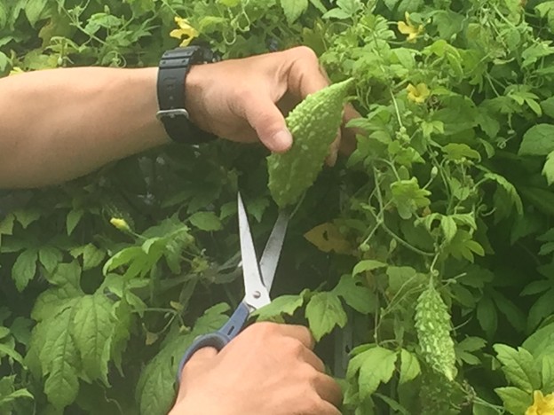 ▼あやしいゴーヤ、収穫してもらう!一応、ゴーヤの葉がブラインドの代わりになり、冷房費用を減少させる環境対策らしいが…効果は???