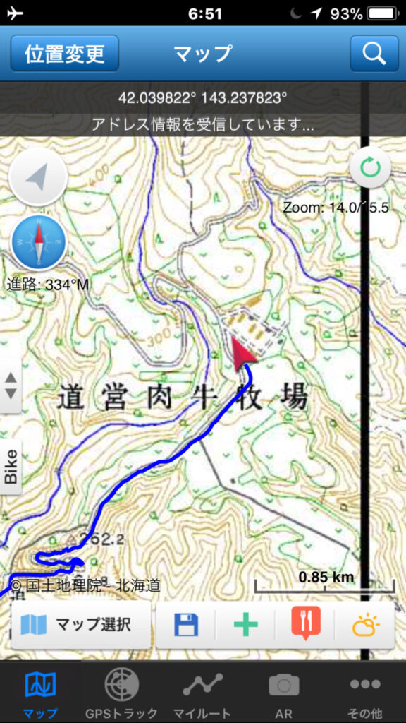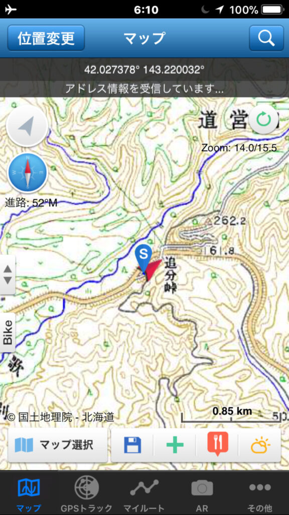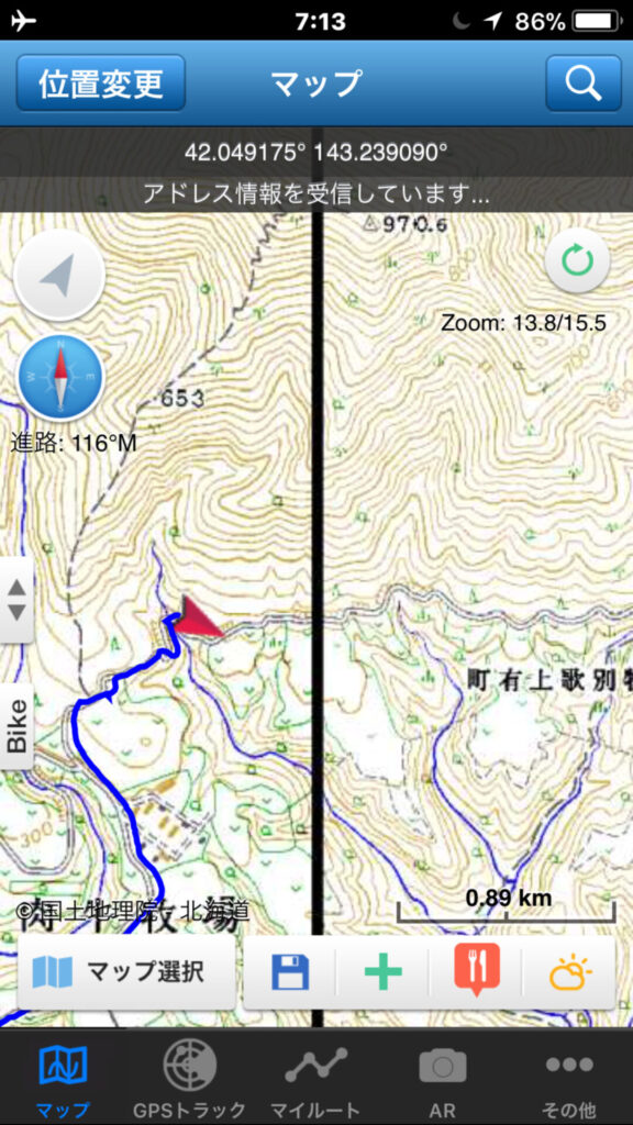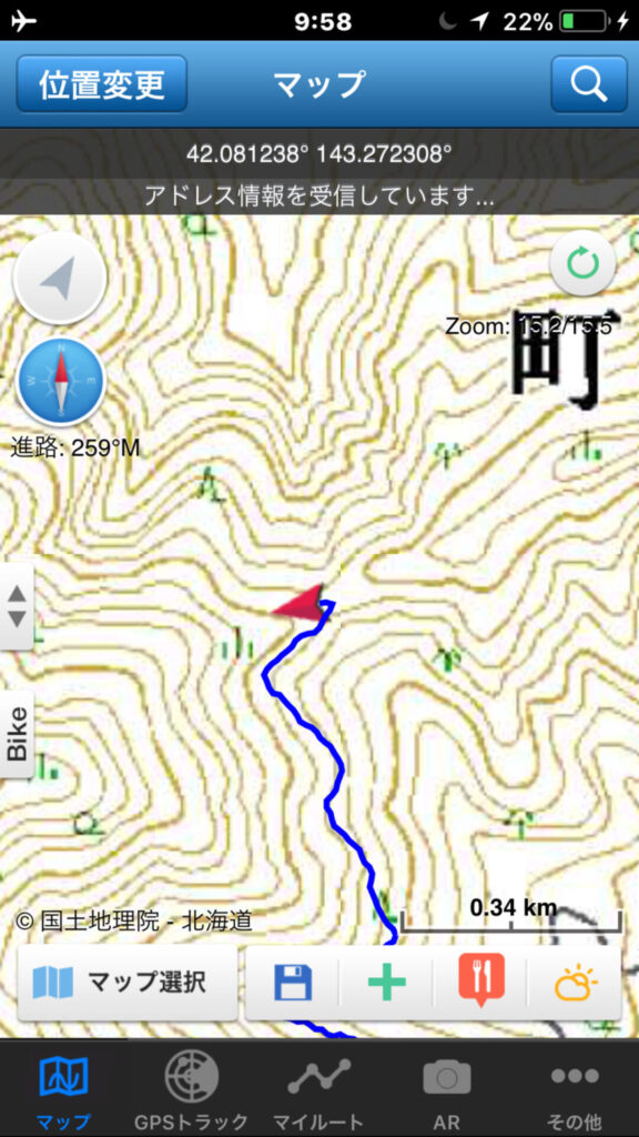 ▼手持ちの地図を見ると林道と人道が交差している。林道を進む!