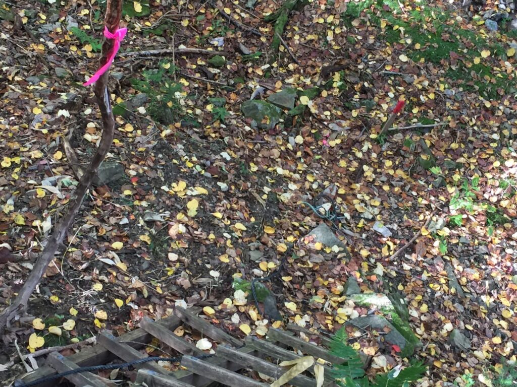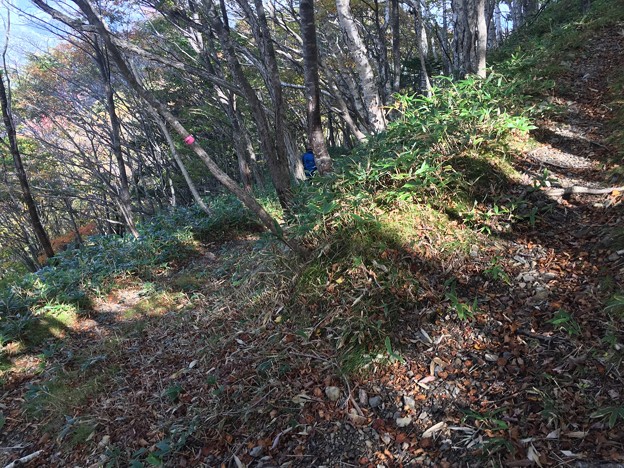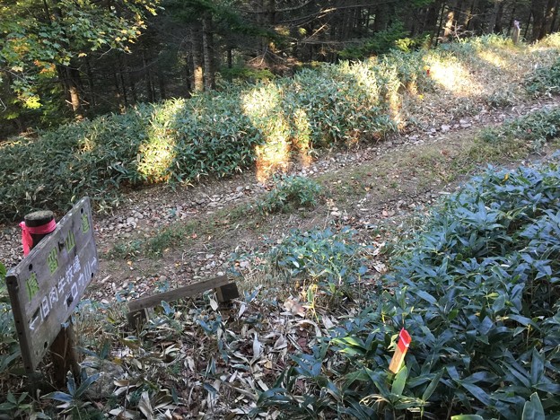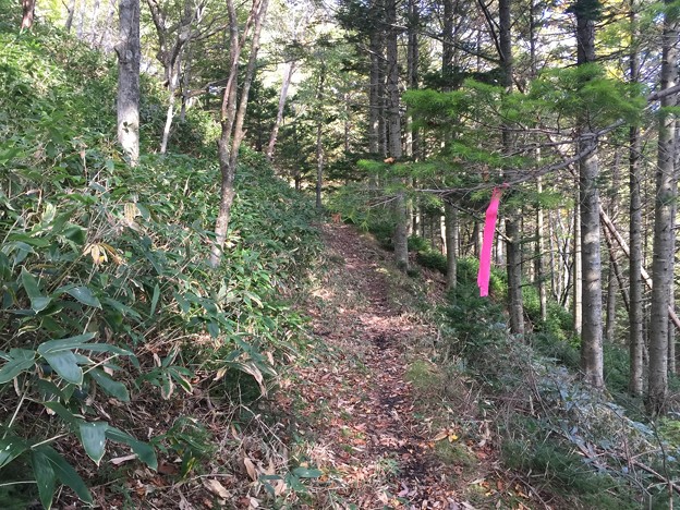 ▼林道を横切り(測量調査が山道の全般に行われており、見出し杭やピンクテープが随所にある。)
